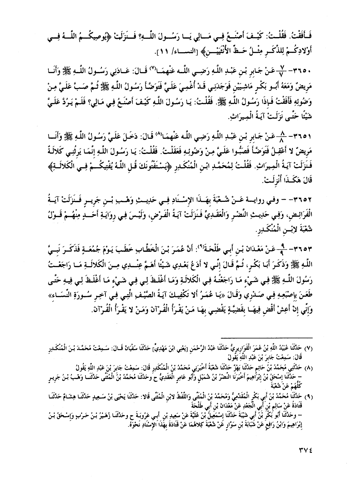 3652 - - وفي رواية عن شعبة بهذا الإسناد في حديث وهب بن جرير فنزلت آية الفرائض، وفي حديث النضر والعقدي فنزلت آية الفرض، وليس في رواية أحد منهم قول شعبة لابن المنكدر.