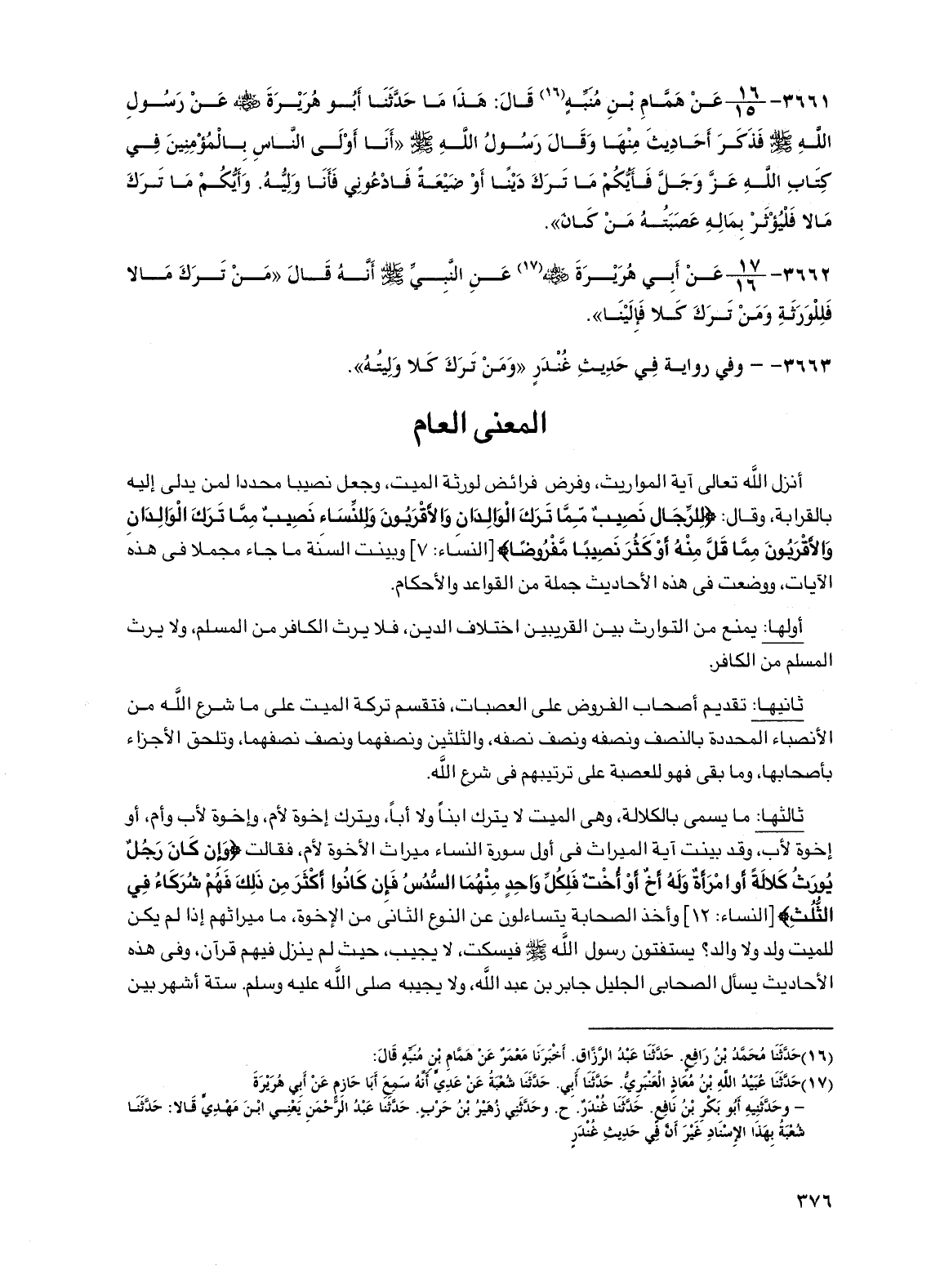3662 - عن أبي هريرة رضي الله عنه عن النبي صلى الله عليه وسلم أنه قال "من ترك مالاً فللورثة ومن ترك كلاً فإلينا".