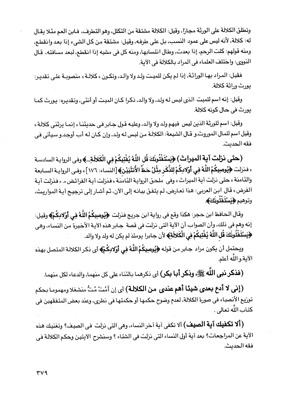 وقيل: اسم للورثة الذين ليس فيهم ولد ولا والد، وعليه قول جابر في حديثنا "إنما يرثني كلالة" وقيل اسم للمال الموروث. وقال الشيعة: الكلالة من ليس له ولد، وإن كان له أب أو جد. وسيأتي في فقه الحديث.