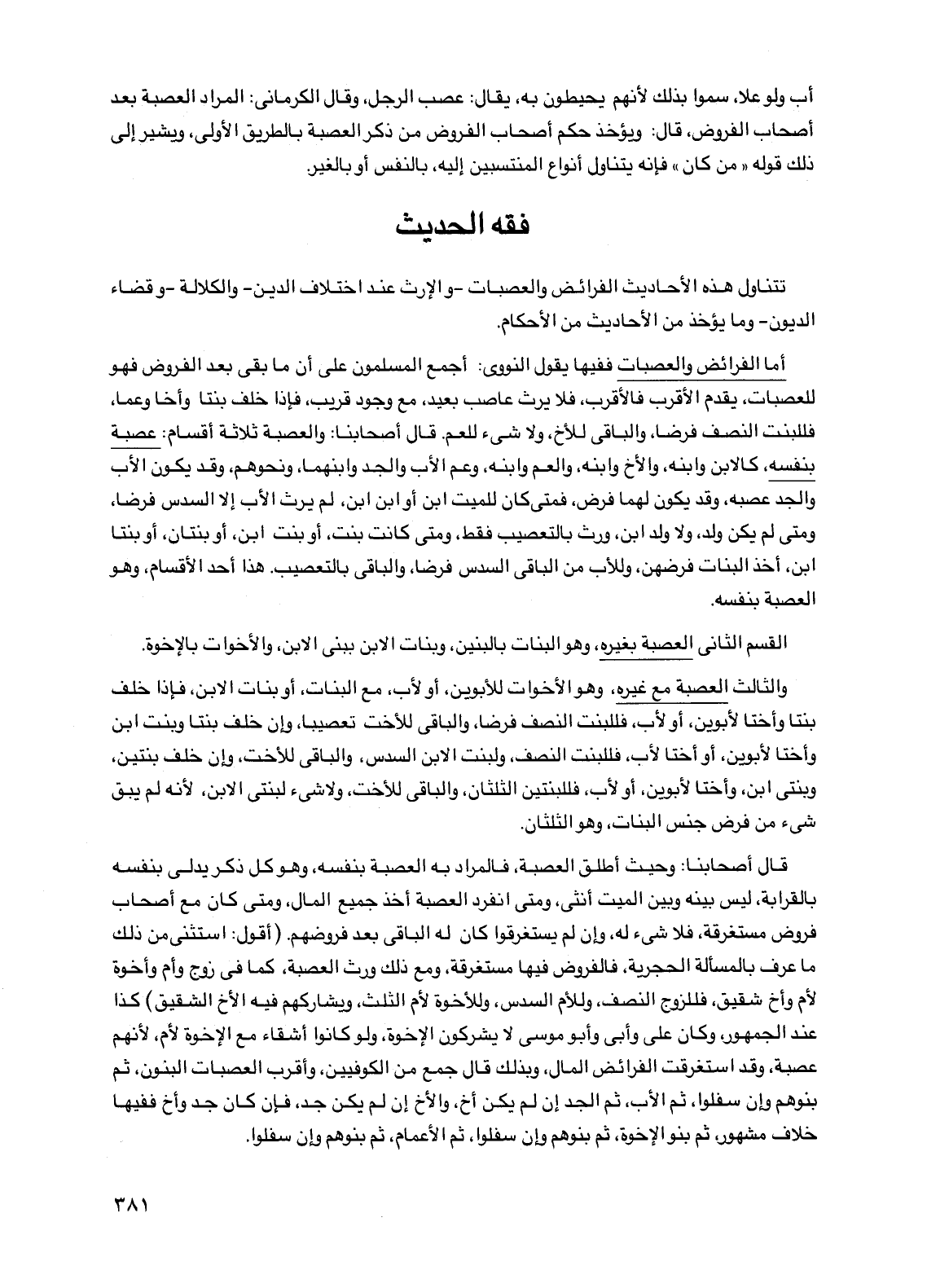 قال أصحابنا: وحيث أطلق العصبة، فالمراد به العصبة بنفسه، وهو كل ذكر يدلي بنفسه بالقرابة، ليس بينه وبين الميت أنثى، ومتى انفرد العصبة أخذ جميع المال، ومتى كان مع أصحاب فروض مستغرقة، فلا شيء له، وإن لم يستغرقوا كان له الباقي بعد فروضهم. (أقول: استثنى من ذلك ما عرف بالمسألة الحجرية، فالفروض فيها مستغرقة، ومع ذلك ورث العصبة، كما في زوج وأم وأخوة لأم وأخ شقيق، فللزوج النصف، وللأم السدس، وللأخوة لأم الثلث، ويشاركهم فيه الأخ الشقيق) كذا عند الجمهور، وكان علي وأبي وأبو موسى لا يشركون الإخوة، ولو كانوا أشقاء مع الإخوة لأم، لأنهم عصبة، وقد استغرقت الفرائض المال، وبذلك قال جمع من الكوفيين، وأقرب العصبات البنون، ثم بنوهم وإن سفلوا، ثم الأب، ثم الجد إن لم يكن أخ، والأخ إن لم يكن جد، فإن كان جد وأخ ففيها خلاف مشهور، ثم بنو الإخوة، ثم بنوهم وإن سفلوا، ثم الأعمام، ثم بنوهم وإن سفلوا.