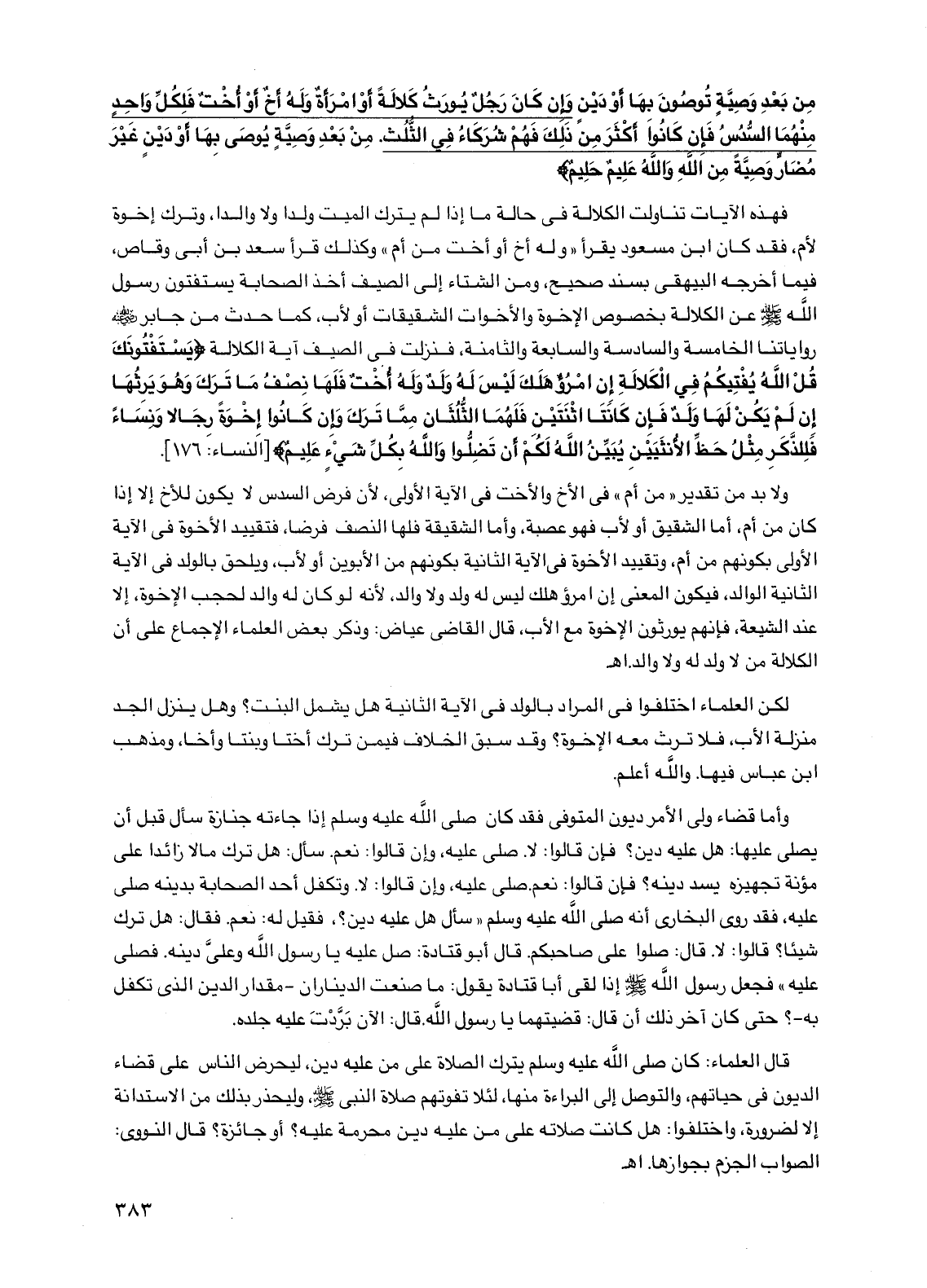 فهذه الآيات تناولت الكلالة في حالة ما إذا لم يترك الميت ولدًا ولا والدًا، وترك إخوة لأم، فقد كان ابن مسعود يقرأ "وله أخ أو أخت من أم" وكذلك قرأ سعد بن أبي وقاص، فيما أخرجه البيهقي بسند صحيح، ومن الشتاء إلى الصيف أخذ الصحابة يستفتون رسول الله صلى الله عليه وسلم عن الكلالة بخصوص الإخوة والأخوات الشقيقات أو لأب، كما حدث من جابر رضي الله عنه رواياتنا الخامسة والسادسة والسابعة والثامنة، فنزلت في الصيف آية الكلالة {يستفتونك قل الله يفتيكم في الكلالة إن امرؤ هلك ليس له ولد وله أخت فلها نصف ما ترك وهو يرثها إن لم يكن لها ولد فإن كانتا اثنتين فلهما الثلثان مما ترك وإن كانوا إخوة رجالاً ونساء فللذكر مثل حظ الأنثيين يبين الله لكم أن تضلوا والله بكل شيء عليم} [النساء: 176].