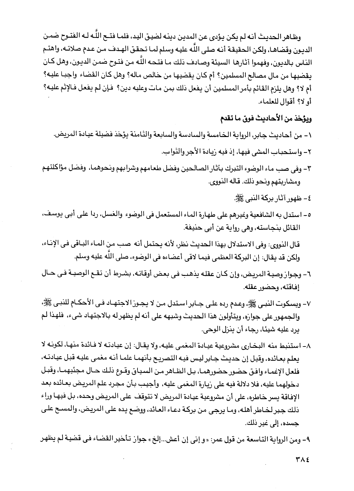 8 - استنبط منه البخاري مشروعية عيادة المغمى عليه، ولا يقال: إن عيادته لا فائدة منها، لكونه لا يعلم بعائده، وقيل إن حديث جابر ليس فيه التصريح بأنهما علما أنه مغمى عليه قبل عيادته، فلعل الإغماء وافق حضور حضورهما، بل الظاهر من السياق وقوع ذلك حال مجئيهما، وقبل دخولهما عليه، فلا دلالة فيه على زيارة المغمى عليه، وأجيب بأن مجرد علم المريض بعائده بعد الإفاقة يسر خاطره، على أن مشروعية عيادة المريض لا تتوقف على المريض وحده، بل فيها وراء ذلك جبر لخاطر أهله، وما يرجى من بركة دعاء العائد، ووضع يده على المريض، والمسح على جسده، إلى غير ذلك.