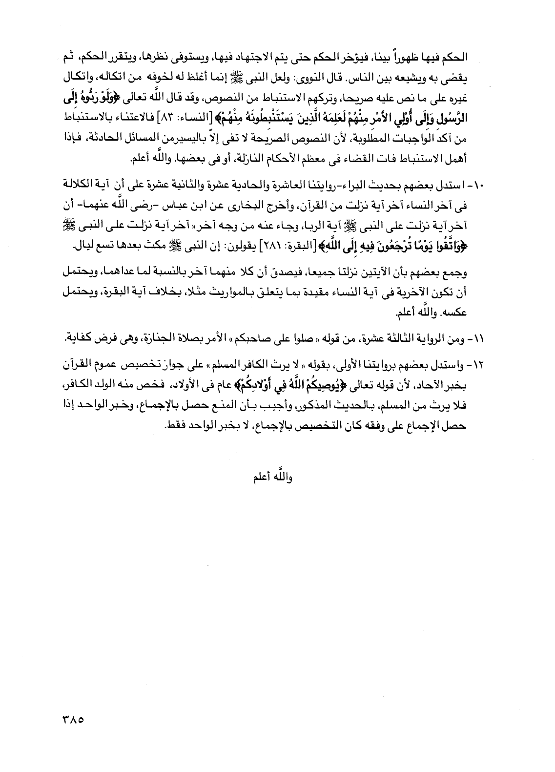 10 - استدل بعضهم بحديث البراء - روايتنا العاشرة والحادية عشرة والثانية عشرة على أن آية الكلالة في آخر النساء آخر آية نزلت من القرآن، وأخرج البخاري عن ابن عباس - رضي الله عنهما - أن آخر آية نزلت على النبي صلى الله عليه وسلم آية الربا، وجاء عنه من وجه آخر "آخر آية نزلت على النبي صلى الله عليه وسلم {واتقوا يومًا ترجعون فيه إلى الله} [البقرة: 281] يقولون: إن النبي صلى الله عليه وسلم مكث بعدها تسع ليال.