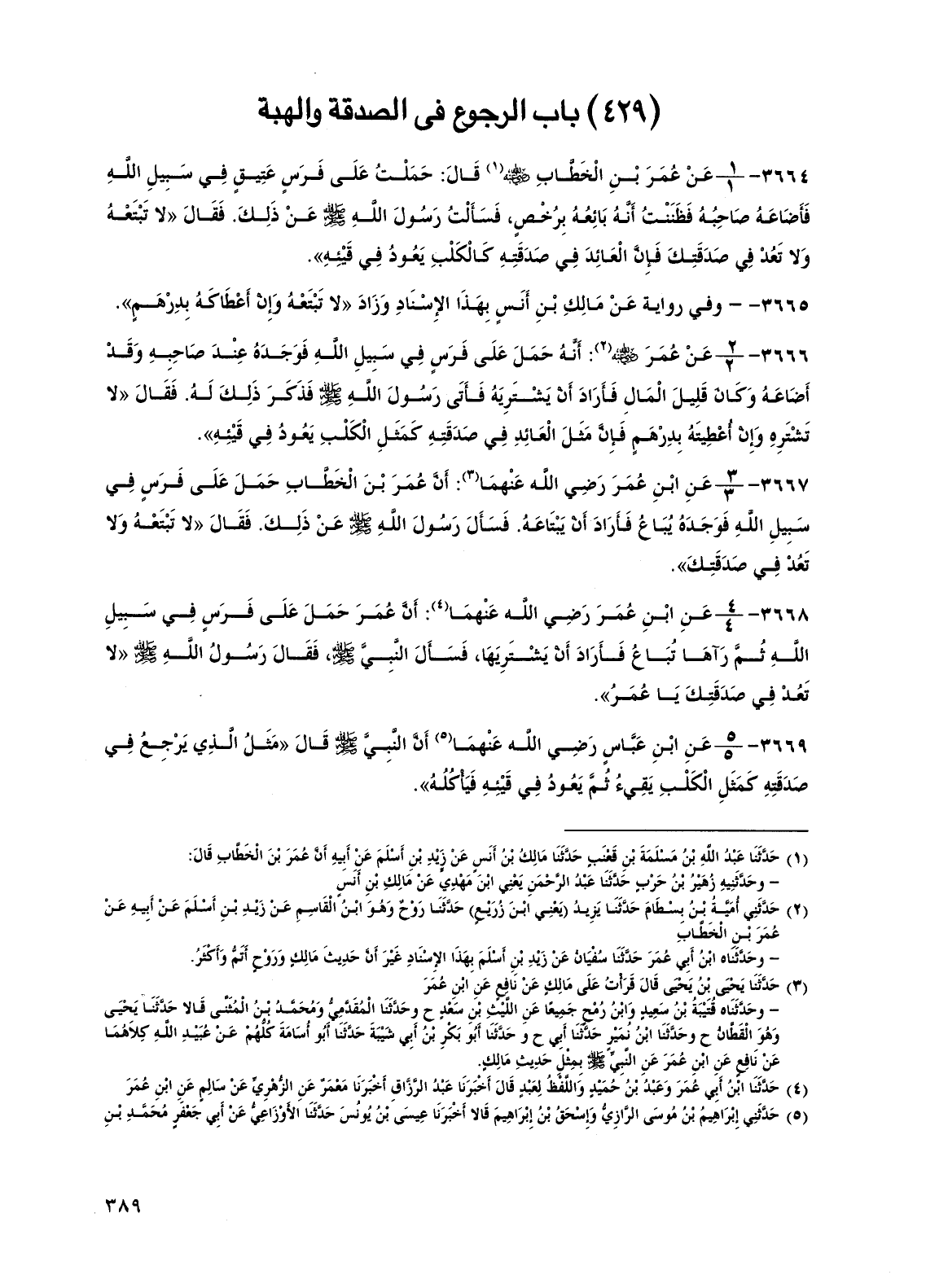 3666 - عن عمر رضي الله عنه: أنه حمل على فرس في سبيل الله فوجده عند صاحبه وقد أضاعه وكان قليل المال فأراد أن يشتريه فأتى رسول الله صلى الله عليه وسلم فذكر ذلك له. فقال "لا تشتره وإن أعطيته بدرهم فإن مثل العائد في صدقته كمثل الكلب يعود في قيئه".