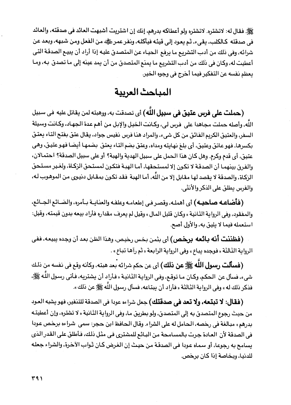 (فقال: لا تبتعه، ولا تعد في صدقتك) جعل شراءه عودًا في الصدقة للتنفير، فهو يشبه العود من حيث رجوع المتصدق به إلى المتصدق، ولو بطريق ما، وفي الرواية الثانية "لا تشتره، وإن أعطيته بدرهم" مبالغة في رخصه، الحامل له على الشراء. وقال الحافظ ابن حجر: سمي شراءه برخص عودًا في الصدقة لأن العادة جرت بالمسامحة من البائع للمشتري في مثل ذلك، فأطلق على القدر الذي يسامح به رجوعًا، أو سماه عودًا في الصدقة من حيث إن الغرض كان ثواب الآخرة، والشراء جعله للدنيا، وبخاصة إذا كان برخص.