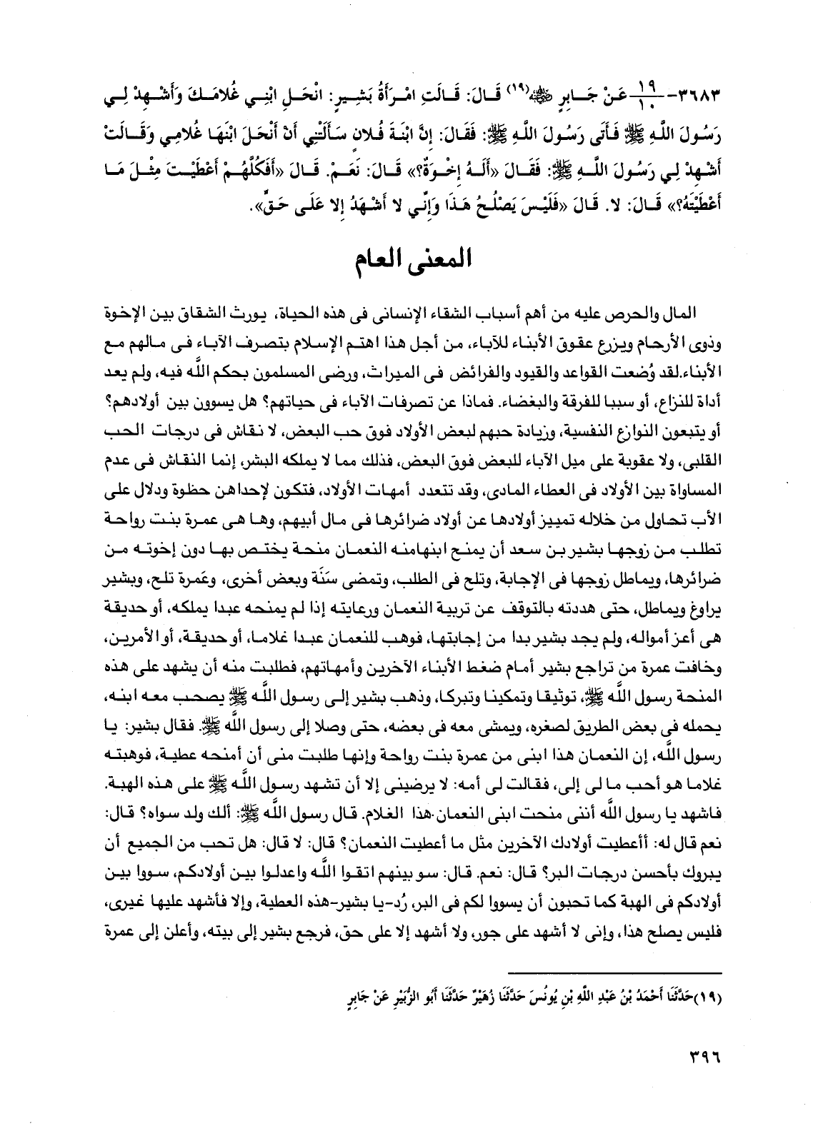 فاشهد يا رسول الله أنني منحت ابني النعمان هذا الغلام. قال رسول الله صلى الله عليه وسلم: ألك ولد سواه؟ قال: نعم قال له: أأعطيت أولادك الآخرين مثل ما أعطيت النعمان؟ قال: لا قال: هل تحب من الجميع أن يبروك بأحسن درجات البر؟ قال: نعم. قال: سو بينهم اتقوا الله واعدلوا بين أولادكم، سووا بين أولادكم في الهبة كما تحبون أن يسووا لكم في البر، رد - يا بشير - هذه العطية، وإلا فأشهد عليها غيري، فليس يصلح هذا، وإني لا أشهد على جور، ولا أشهد إلا على حق، فرجع بشير إلى بيته، وأعلن إلى عمرة