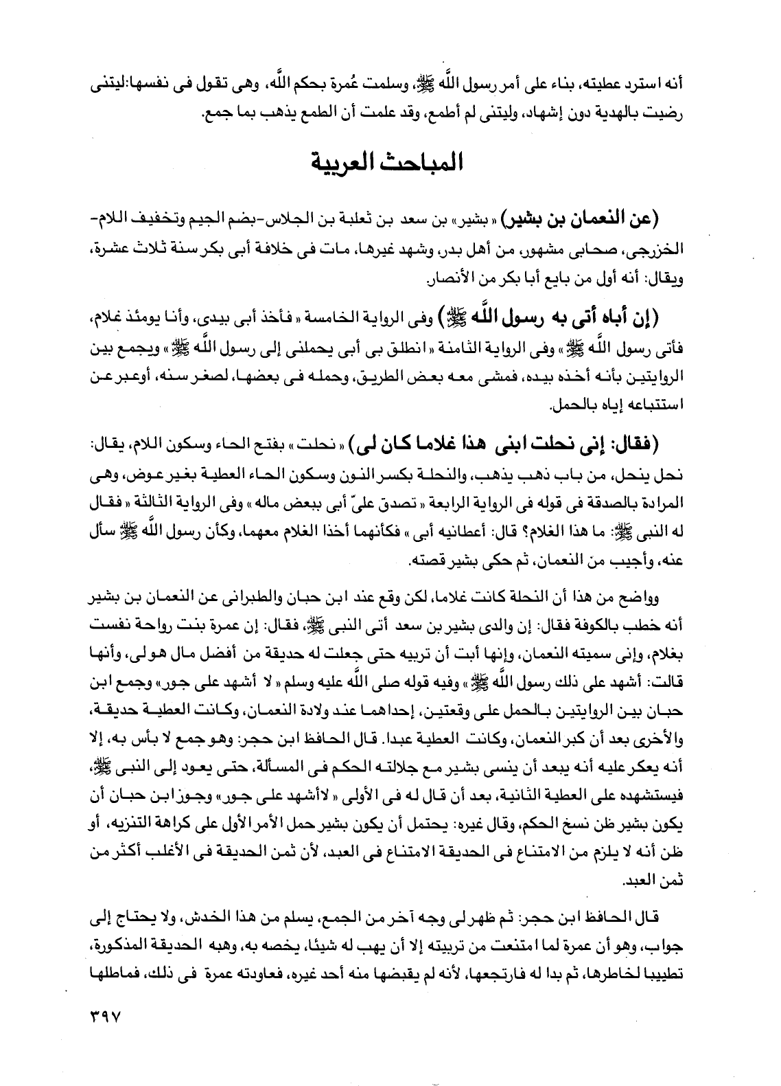وواضح من هذا أن النحلة كانت غلامًا، لكن وقع عند ابن حبان والطبراني عن النعمان بن بشير أنه خطب بالكوفة فقال: إن والدي بشير بن سعد أتى النبي صلى الله عليه وسلم، فقال: إن عمرة بنت رواحة نفست بغلام، وإني سميته النعمان، وإنها أبت أن تربيه حتى جعلت له حديقة من أفضل مال هو لي، وأنها قالت: أشهد على ذلك رسول الله صلى الله عليه وسلم" وفيه قوله صلى الله عليه وسلم "لا أشهد على جور" وجمع ابن حبان بين الروايتين بالحمل على وقعتين، إحداهما عند ولادة النعمان، وكانت العطية حديقة، والأخرى بعد أن كبر النعمان، وكانت العطية عبدًا. قال الحافظ ابن حجر: وهو جمع لا بأس به، إلا أنه يعكر عليه أنه يبعد أن ينسى بشير مع جلالته الحكم في المسألة، حتى يعود إلى النبي صلى الله عليه وسلم، فيستشهده على العطية الثانية، بعد أن قال له في الأولى "لا أشهد على جور" وجوز ابن حبان أن يكون بشير ظن نسخ الحكم، وقال غيره: يحتمل أن يكون بشير حمل الأمر الأول على كراهة التنزيه، أو ظن أنه لا يلزم من الامتناع في الحديقة الامتناع في العبد، لأن ثمن الحديقة في الأغلب أكثر من ثمن العبد.