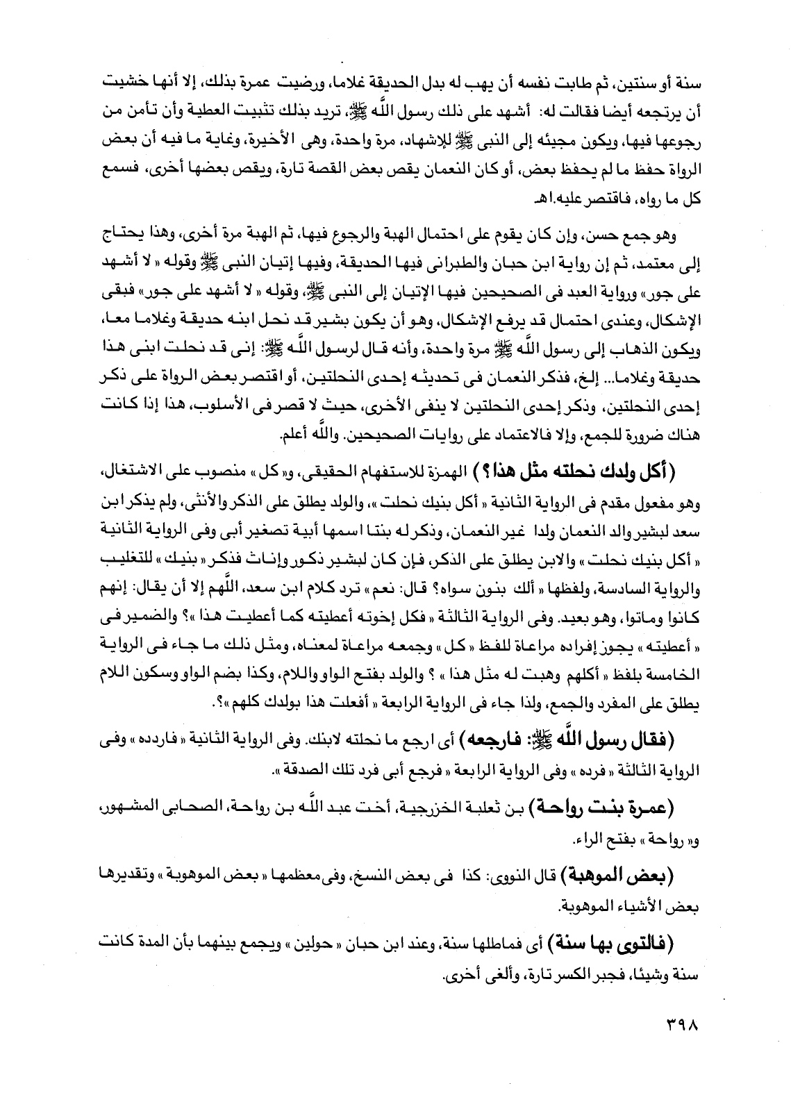 (أكل ولدك نحلته مثل هذا؟ ) الهمزة للاستفهام الحقيقي، و"كل" منصوب على الاشتغال، وهو مفعول مقدم في الرواية الثانية "أكل بنيك نحلت"، والولد يطلق على الذكر والأنثى، ولم يذكر ابن سعد لبشير والد النعمان ولدًا غير النعمان، وذكر له بنتًا اسمها أبية تصغير أبي وفي الرواية الثانية "أكل بنيك نحلت" والابن يطلق على الذكر، فإن كان لبشير ذكور وإناث فذكر "بنيك" للتغليب والرواية السادسة، ولفظها "ألك بنون سواه؟ قال: نعم" ترد كلام ابن سعد، اللهم إلا أن يقال: إنهم كانوا وماتوا، وهو بعيد. وفي الرواية الثالثة "فكل إخوته أعطيته كما أعطيت هذا"؟ والضمير في "أعطيته" يجوز إفراده مراعاة للفظ "كل" وجمعه مراعاة لمعناه، ومثل ذلك ما جاء في الرواية الخامسة بلفظ "أكلهم وهبت له مثل هذا"؟ والولد بفتح الواو واللام، وكذا بضم الواو وسكون اللام يطلق على المفرد والجمع، ولذا جاء في الرواية الرابعة "أفعلت هذا بولدك كلهم"؟ .