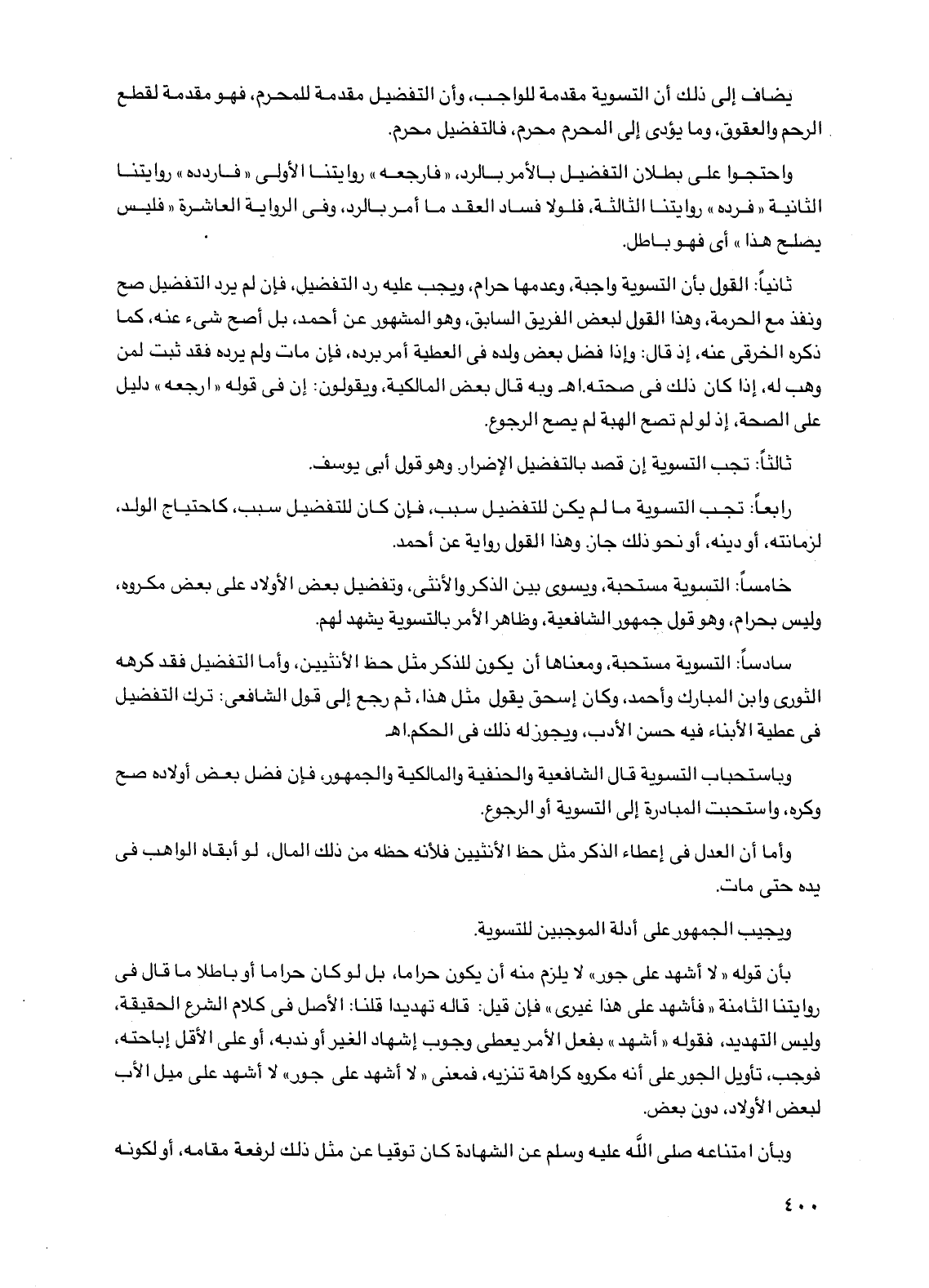 ثانيًا: القول بأن التسوية واجبة، وعدمها حرام، ويجب عليه رد التفضيل، فإن لم يرد التفضيل صح ونفذ مع الحرمة، وهذا القول لبعض الفريق السابق، وهو المشهور عن أحمد، بل أصح شيء عنه، كما ذكره الخرقي عنه، إذ قال: وإذا فضل بعض ولده في العطية أمر برده، فإن مات ولم يرده فقد ثبت لمن وهب له، إذا كان ذلك في صحته. اهـ وبه قال بعض المالكية، ويقولون: إن في قوله "ارجعه" دليل على الصحة، إذ لو لم تصح الهبة لم يصح الرجوع.