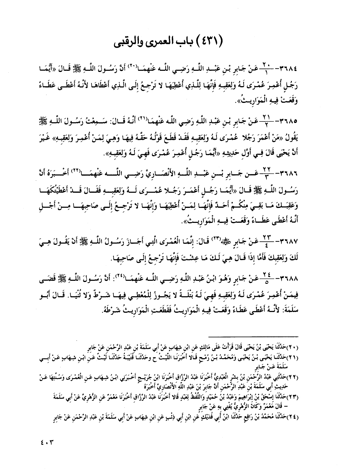 3684 - عن جابر بن عبد الله رضي الله عنهما أن رسول الله صلى الله عليه وسلم قال "أيما رجل أعمر عمرى له ولعقبه فإنها للذي أعطيها لا ترجع إلى الذي أعطاها لأنه أعطى عطاء وقعت فيه المواريث".