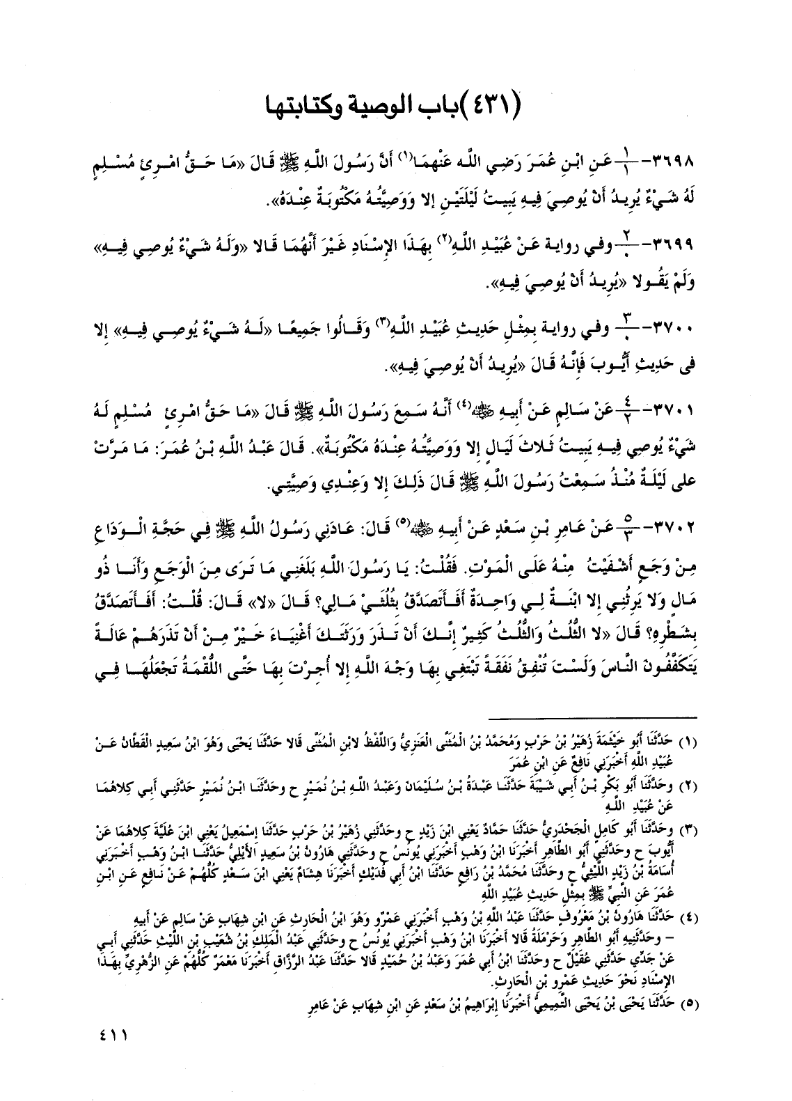 3701 - عن سالم عن أبيه رضي الله عنه أنه سمع رسول الله صلى الله عليه وسلم قال "ما حق امرئ مسلم له شيء يوصي فيه يبيت ثلاث ليال إلا ووصيته عنده مكتوبة". قال عبد الله بن عمر: ما مرت علي ليلة منذ سمعت رسول الله صلى الله عليه وسلم قال ذلك إلا وعندي وصيتي.