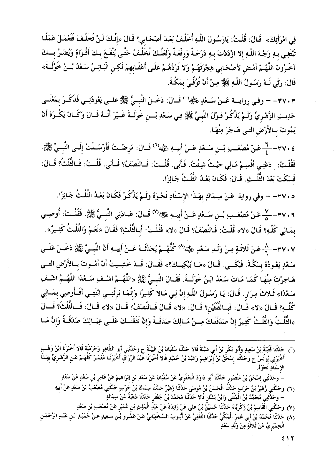 3707 - عن ثلاثة من ولد سعد رضي الله عنه كلهم يحدثه عن أبيه أن النبي صلى الله عليه وسلم دخل على سعد يعوده بمكة. فبكى. قال "ما يبكيك؟ " فقال: قد خشيت أن أموت بالأرض التي هاجرت منها كما مات سعد بن خولة. فقال النبي صلى الله عليه وسلم "اللهم اشف سعدًا اللهم اشف سعدًا" ثلاث مرار. قال: يا رسول الله إن لي مالاً كثيرًا وإنما يرثني ابنتي أفأوصي بمالي كله؟ قال "لا" قال: فبالثلثين؟ قال: "لا" قال فالنصف؟ قال "لا" قال: فالثلث؟ قال "الثلث والثلث كثير إن صدقتك من مالك صدقة وإن نفقتك على عيالك صدقة وإن ما