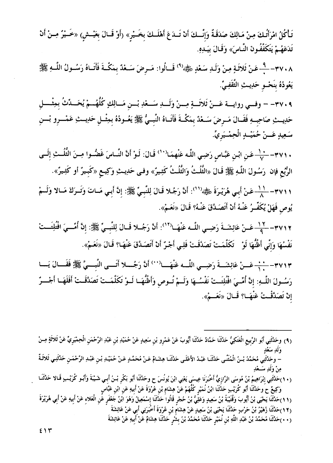 3709 - - وفي رواية عن ثلاثة من ولد سعد بن مالك كلهم يحدث بمثل حديث صاحبه فقال مرض سعد بمكة فأتاه النبي صلى الله عليه وسلم يعوده بمثل حديث عمرو بن سعيد عن حميد الحميري.