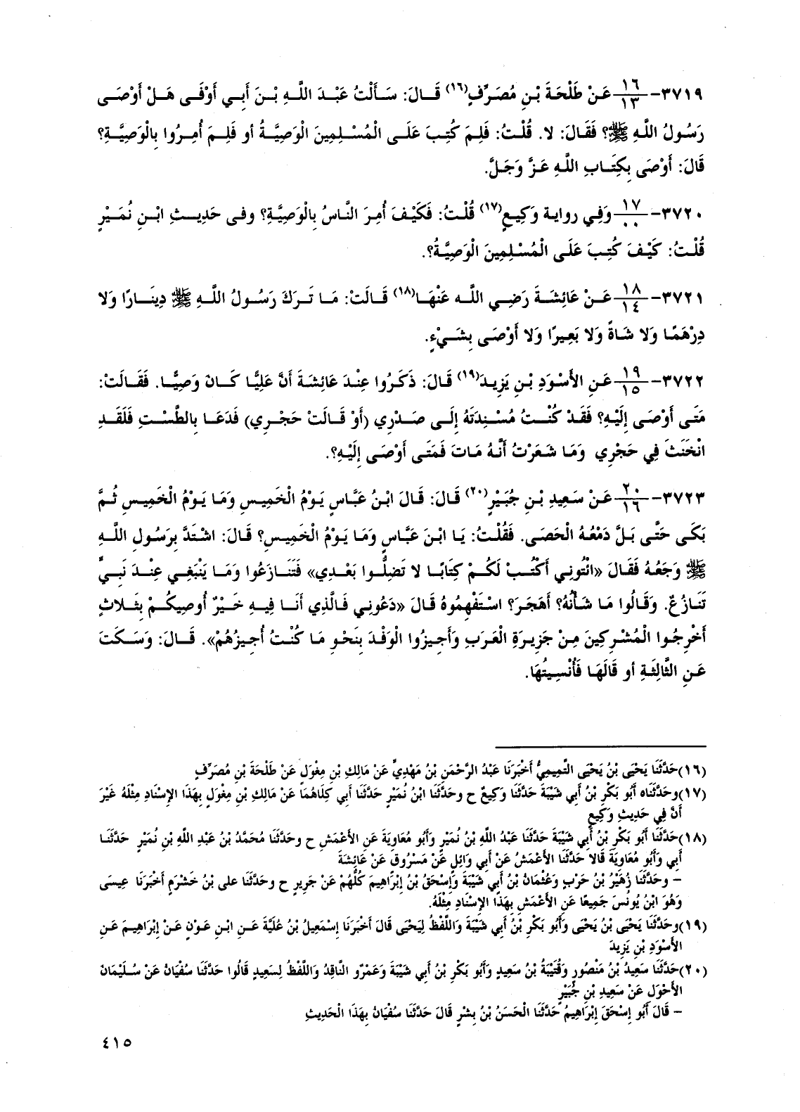 3719 - عن طلحة بن مصرف قال: سألت عبد الله بن أبي أوفى هل أوصى رسول الله صلى الله عليه وسلم؟ فقال: لا. قلت: فلم كتب على المسلمين الوصية أو فلم أمروا بالوصية؟ قال: أوصى بكتاب الله عز وجل.
