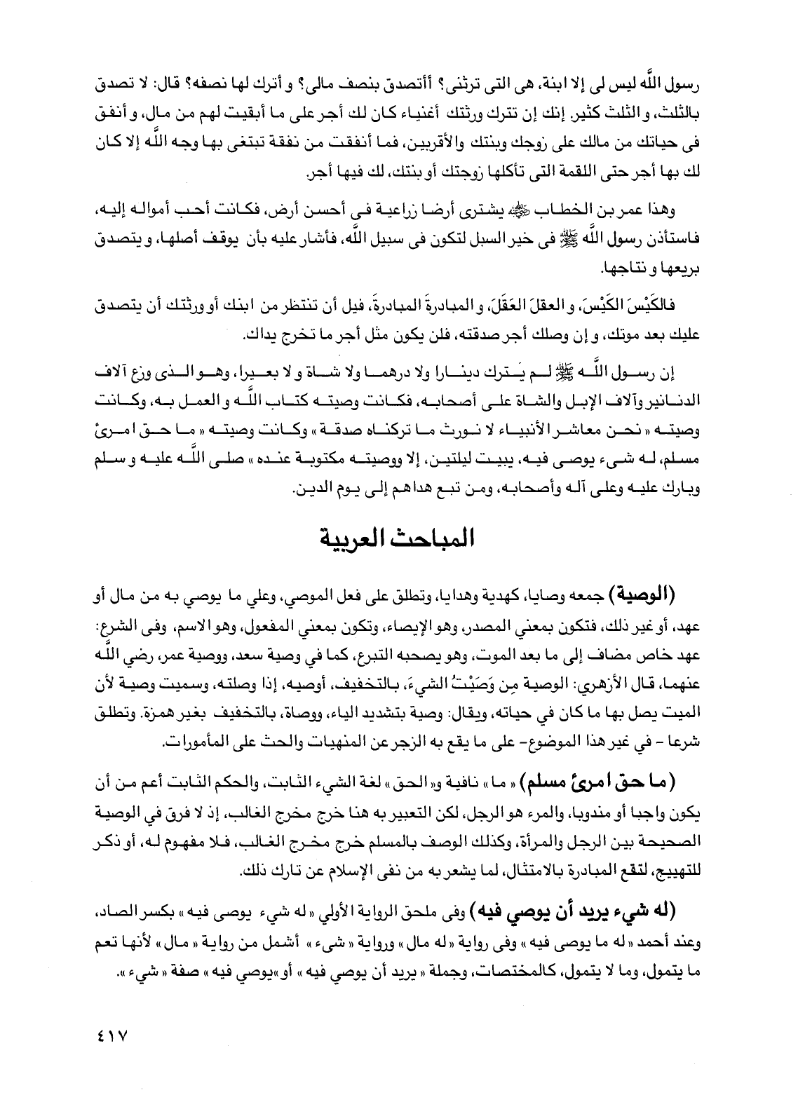 إن رسول الله صلى الله عليه وسلم لم يترك دينارًا ولا درهمًا ولا شاة ولا بعيرًا، وهو الذي وزع آلاف الدنانير وآلاف الإبل والشاة على أصحابه، فكانت وصيته كتاب الله والعمل به، وكانت وصيته "نحن معاشر الأنبياء لا نورث ما تركناه صدقة" وكانت وصيته "ما حق امرئ مسلم، له شيء يوصي فيه، يبيت ليلتين، إلا ووصيته مكتوبة عنده" صلى الله عليه وسلم وبارك عليه وعلى آله وأصحابه، ومن تبع هداهم إلى يوم الدين.