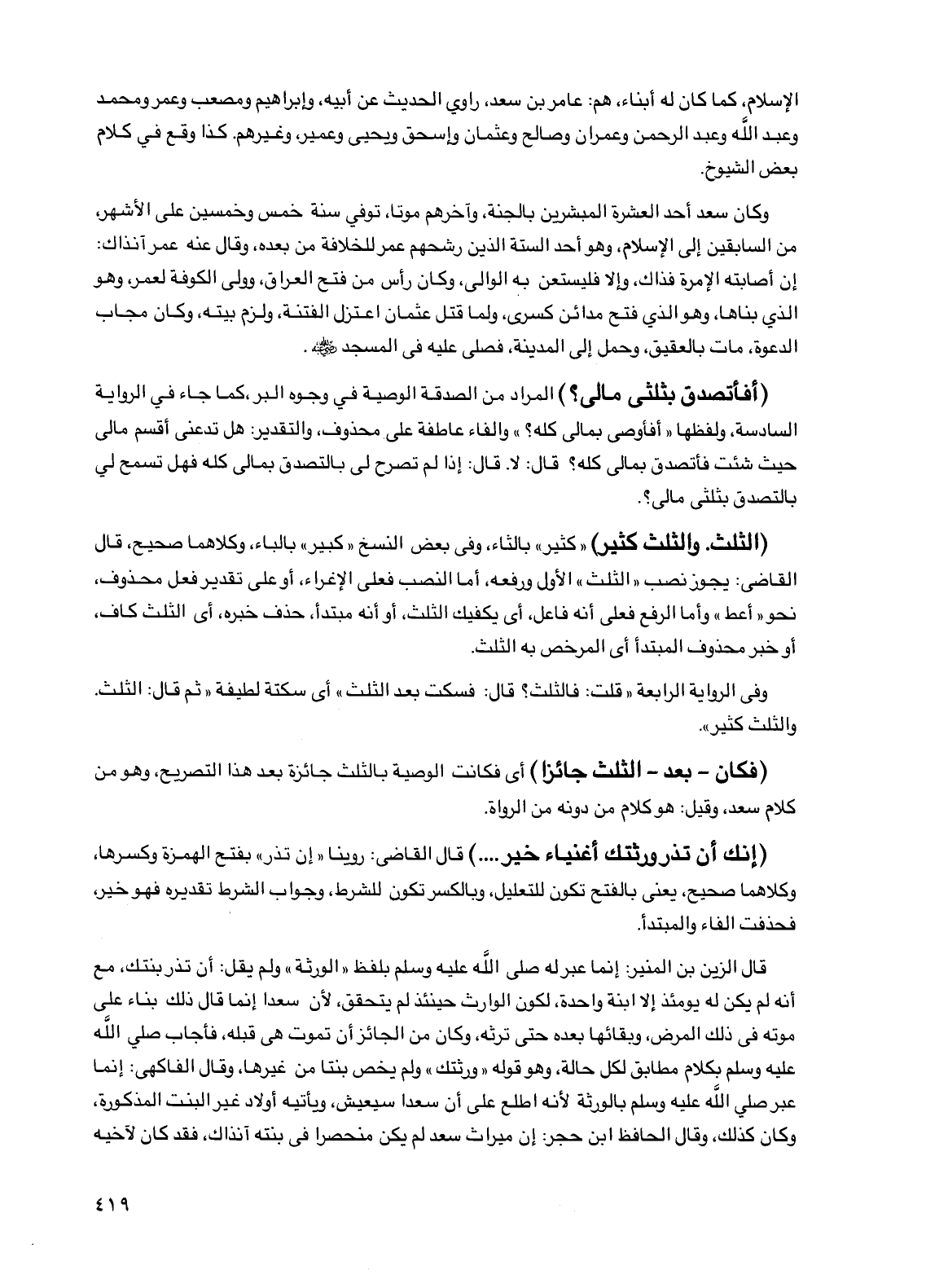 (أفأتصدق بثلثي مالي؟ ) المراد من الصدقة الوصية في وجوه البر، كما جاء في الرواية السادسة، ولفظها "أفأوصي بمالي كله؟ " والفاء عاطفة على محذوف، والتقدير: هل تدعني أقسم مالي حيث شئت فأتصدق بمالي كله؟ قال: لا. قال: إذا لم تصرح لي بالتصدق بمالي كله فهل تسمح لي بالتصدق بثلثي مالي؟ .