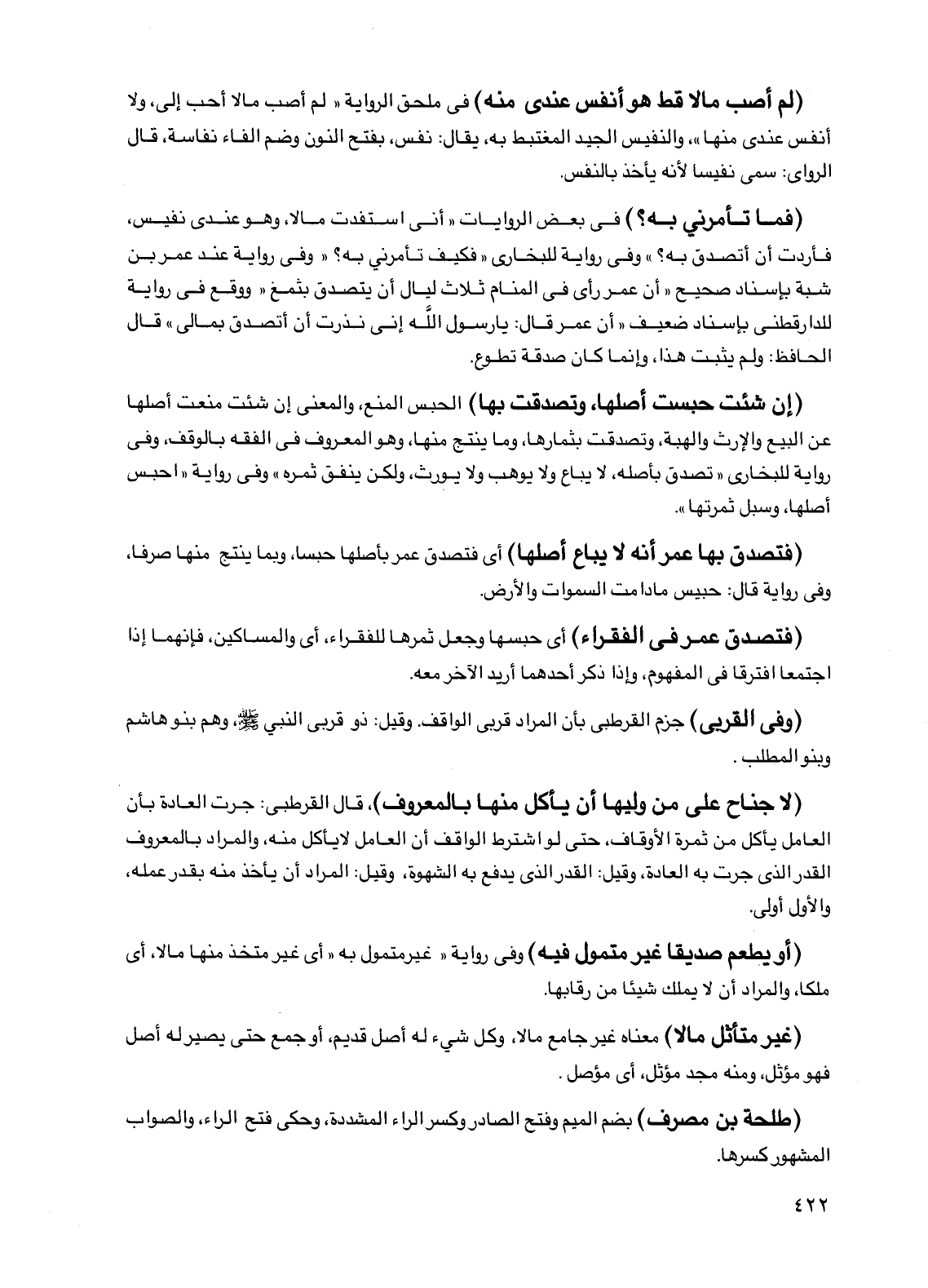 (إن شئت حبست أصلها، وتصدقت بها) الحبس المنع، والمعنى إن شئت منعت أصلها عن البيع والإرث والهبة، وتصدقت بثمارها، وما ينتج منها، وهو المعروف في الفقه بالوقف، وفي رواية للبخاري "تصدق بأصله، لا يباع ولا يوهب ولا يورث، ولكن ينفق ثمره" وفي رواية "احبس أصلها، وسبل ثمرتها".