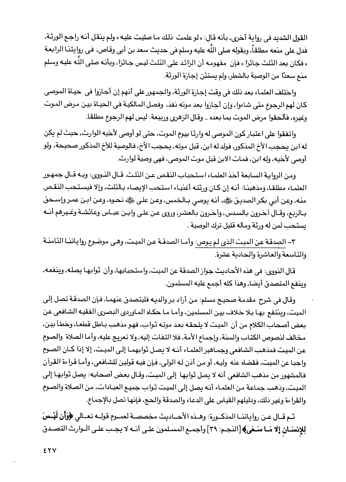 ثم قال عن رواياتنا المذكورة: وهذه الأحاديث مخصصة لعموم قوله تعالى {وأن ليس للإنسان إلا ما سعى} [النجم: 39] وأجمع المسلمون على أنه لا يجب على الوارث التصدق