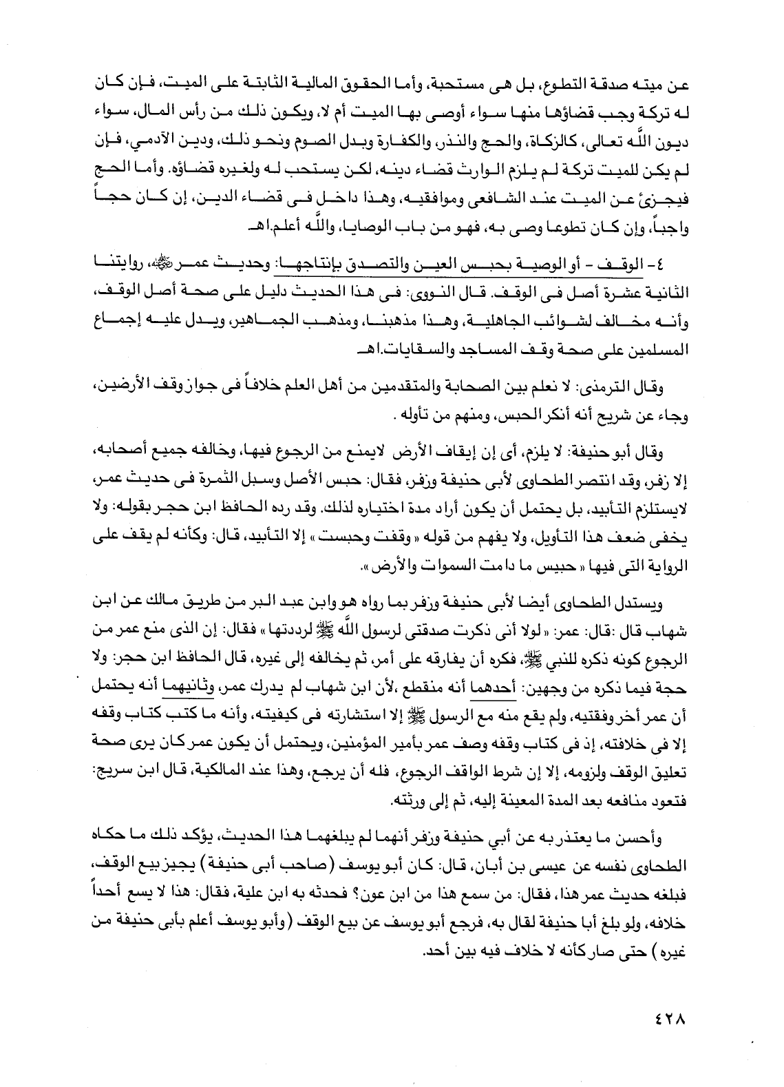 ويستدل الطحاوي أيضًا لأبي حنيفة وزفر بما رواه هو وابن عبد البر من طريق مالك عن ابن شهاب قال: قال عمر: "لولا أني ذكرت صدقتي لرسول الله صلى الله عليه وسلم لرددتها" فقال: إن الذي منع عمر من الرجوع كونه ذكره للنبي صلى الله عليه وسلم، فكرة أن يفارقه على أمر، ثم يخالفه إلى غيره، قال الحافظ ابن حجر: ولا حجة فيما ذكره من وجهين: أحدهما أنه منقطع، لأن ابن شهاب لم يدرك عمر، وثانيهما أنه يحتمل أن عمر أخر وفقتيه، ولم يقع منه مع الرسول صلى الله عليه وسلم إلا استشارته في كيفيته، وأنه ما كتب كتاب وقفه إلا في خلافته، إذ في كتاب وقفه وصف عمر بأمير المؤمنين، ويحتمل أن يكون عمر كان يرى صحة تعليق الوقف ولزومه، إلا إن شرط الواقف الرجوع، فله أن يرجع، وهذا عند المالكية، قال ابن سريج: فتعود منافعه بعد المدة المعينة إليه، ثم إلى ورثته.