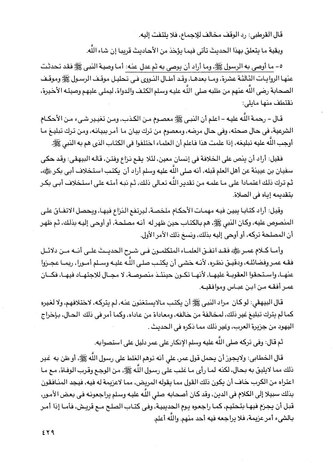 قال البيهقي: لو كان مراد النبي صلى الله عليه وسلم أن يكتب ما لا يستغنون عنه، لم يتركه، لاختلافهم، ولا لغيره كما لم يترك تبليغ غير ذلك، لمخالفة من خالفه، ومعاداة من عاداه، وكما أمر في ذلك الحال، بإخراج اليهود من جزيرة العرب، وغير ذلك مما ذكره في الحديث.