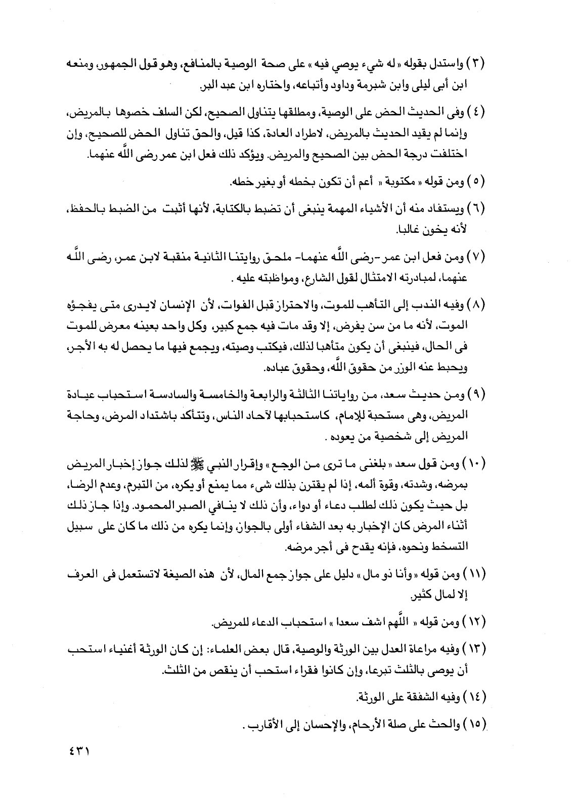 (13) وفيه مراعاة العدل بين الورثة والوصية، قال بعض العلماء: إن كان الورثة أغنياء استحب أن يوصى بالثلث تبرعًا، وإن كانوا فقراء استحب أن ينقص من الثلث.