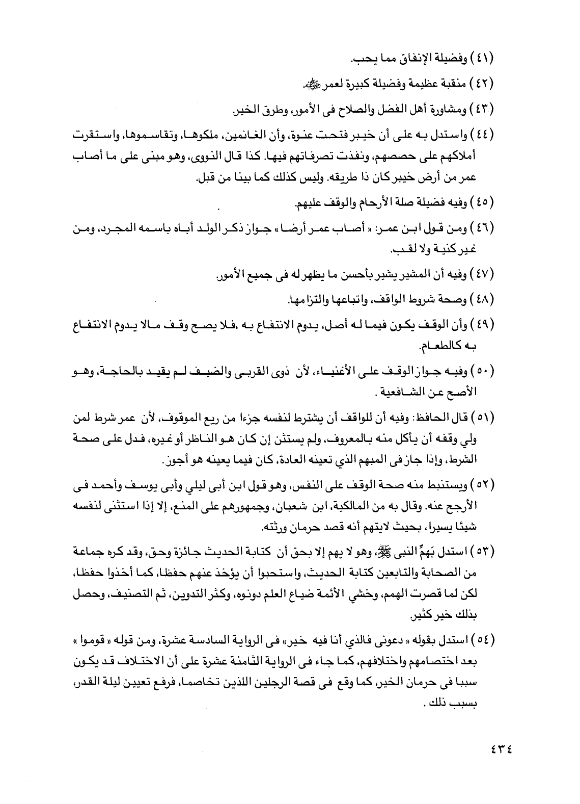 (51) قال الحافظ: وفيه أن للواقف أن يشترط لنفسه جزءًا من ريع الموقوف، لأن عمر شرط لمن ولي وقفه أن يأكل منه بالمعروف، ولم يستثن إن كان هو الناظر أو غيره، فدل على صحة الشرط، وإذا جاز في المبهم الذي تعينه العادة، كان فيما يعينه هو أجوز.