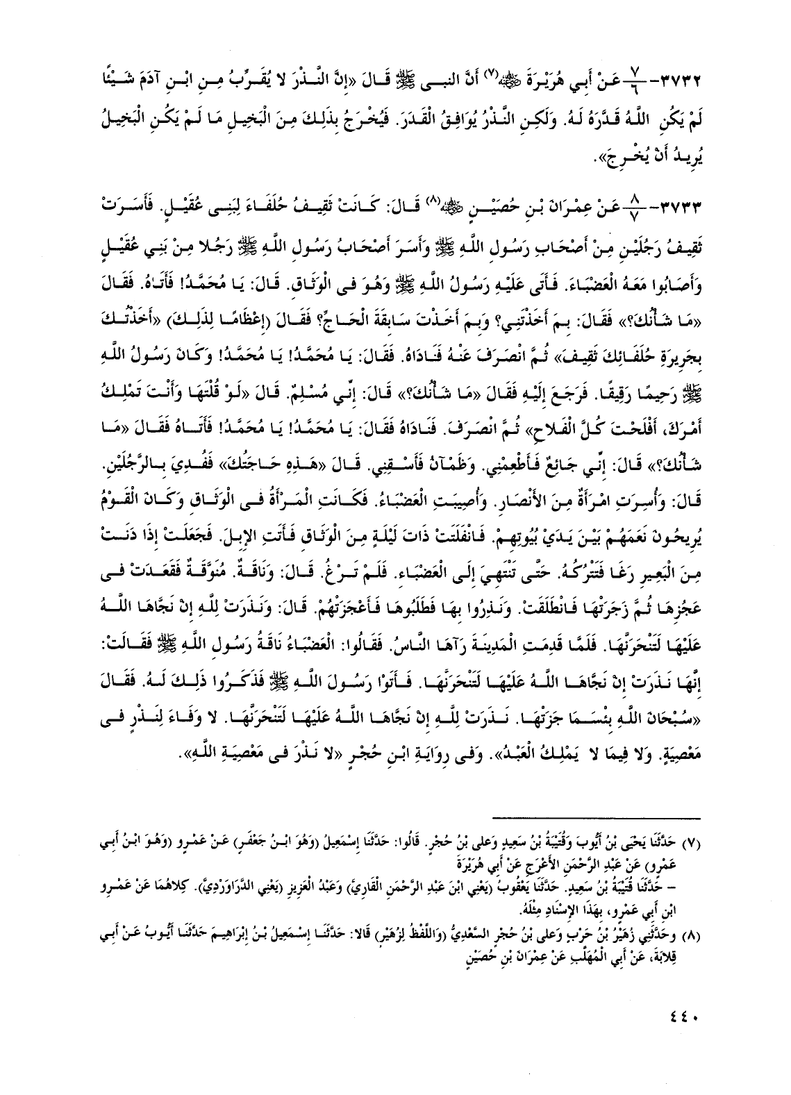 3733 - عن عمران بن حصين رضي الله عنه قال: كانت ثقيف حلفاء لبني عقيل. فأسرت ثقيف رجلين من أصحاب رسول الله صلى الله عليه وسلم وأسر أصحاب رسول الله صلى الله عليه وسلم رجلاً من بني عقيل وأصابوا معه العضباء. فأتى عليه رسول الله صلى الله عليه وسلم وهو في الوثاق. قال: يا محمد! فأتاه. فقال "ما شأنك؟ " فقال: بم أخذتني؟ وبم أخذت سابقة الحاج؟ فقال (إعظامًا لذلك) "أخذتك بجريرة حلفائك ثقيف" ثم انصرف عنه فناداه. فقال: يا محمد! يا محمد! وكان رسول الله صلى الله عليه وسلم رحيمًا رقيقًا. فرجع إليه فقال "ما شأنك؟ " قال: إني مسلم. قال "لو قلتها وأنت تملك أمرك، أفلحت كل الفلاح" ثم انصرف. فناداه فقال: يا محمد! يا محمد! فأتاه فقال "ما شأنك؟ " قال: إني جائع فأطعمني. وظمآن فأسقني. قال "هذه حاجتك" ففدي بالرجلين. قال: وأسرت امرأة من الأنصار. وأصيبت العضباء. فكانت المرأة في الوثاق وكان القوم يريحون نعمهم بين يدي بيوتهم. فانفلتت ذات ليلة من الوثاق فأتت الإبل. فجعلت إذا دنت من البعير رغا فتتركه. حتى تنتهي إلى العضباء. فلم ترغ. قال: وناقة. منوقة فقعدت في عجزها ثم زجرتها فانطلقت. ونذروا بها فطلبوها فأعجزتهم. قال: ونذرت لله إن نجاها الله عليها لتنحرنها. فلما قدمت المدينة رآها الناس. فقالوا: العضباء ناقة رسول الله صلى الله عليه وسلم فقالت: إنها نذرت إن نجاها الله عليها لتنحرنها. فأتوا رسول الله صلى الله عليه وسلم فذكروا ذلك له. فقال "سبحان الله بئسما جزتها. نذرت لله إن نجاها الله عليها لتنحرنها. لا وفاء لنذر في معصية. ولا فيما لا يملك العبد". وفي رواية ابن حجر "لا نذر في معصية الله".