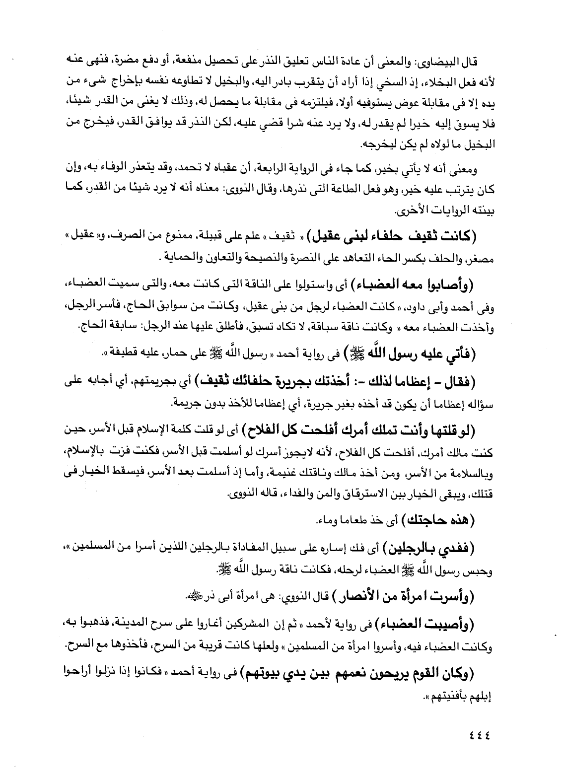 (ففدي بالرجلين) أي فك إساره على سبيل المفاداة بالرجلين اللذين أسرا من المسلمين"، وحبس رسول الله صلى الله عليه وسلم العضباء لرحله، فكانت ناقة رسول الله صلى الله عليه وسلم.