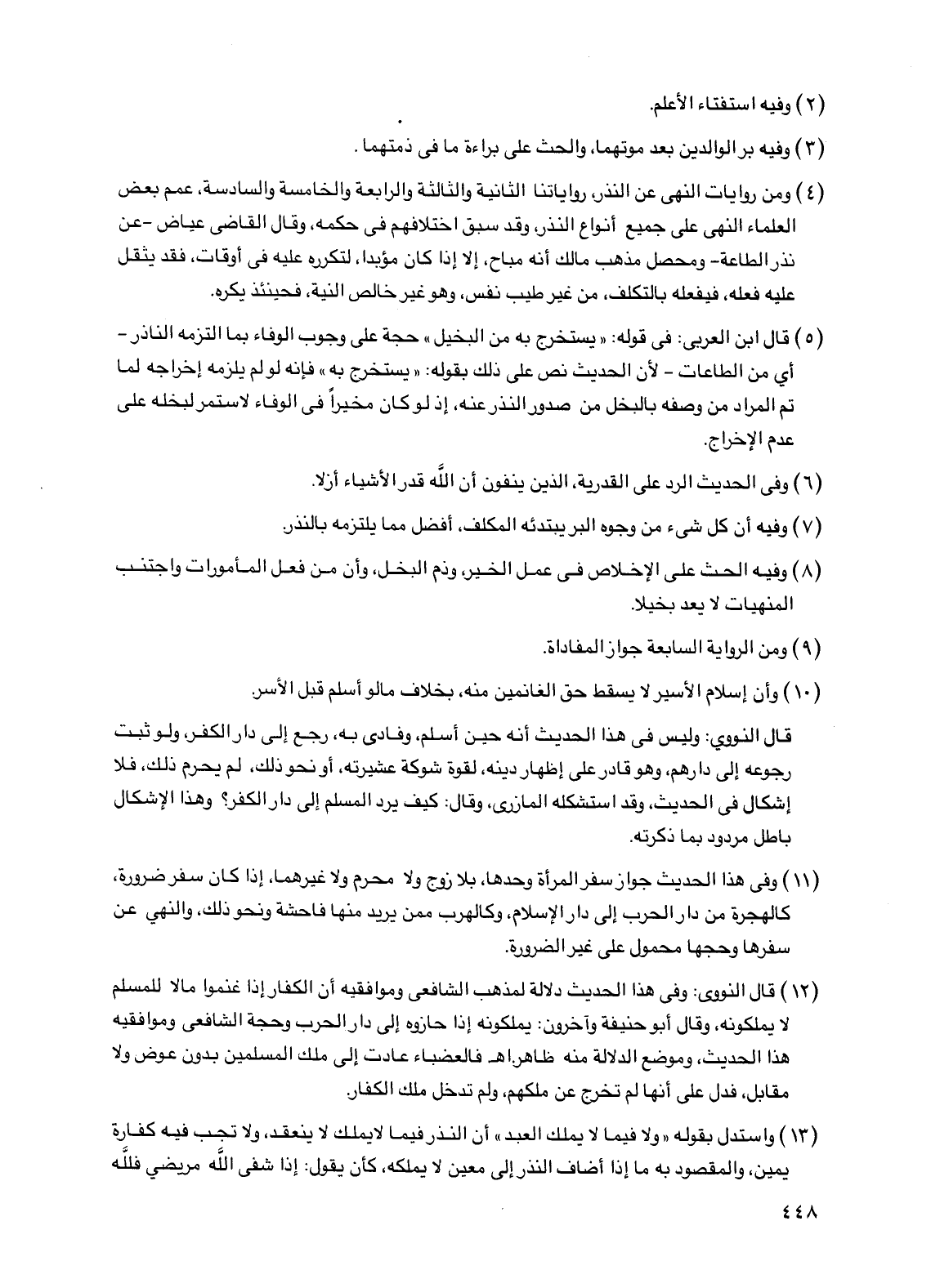 (4) ومن روايات النهي عن النذر، رواياتنا الثانية والثالثة والرابعة والخامسة والسادسة، عمم بعض العلماء النهي على جميع أنواع النذر، وقد سبق اختلافهم في حكمه، وقال القاضي عياض -عن نذر الطاعة - ومحصل مذهب مالك أنه مباح، إلا إذا كان مؤبدًا، لتكرره عليه في أوقات، فقد يثقل عليه فعله، فيفعله بالتكلف، من غير طيب نفس، وهو غير خالص النية، فحينئذ يكره.