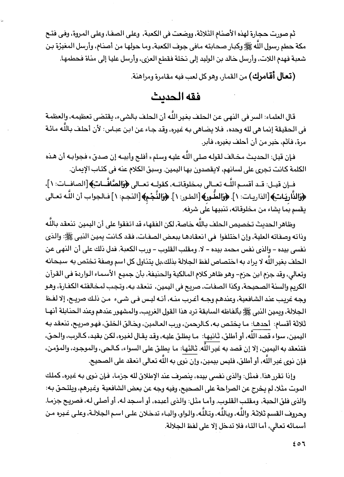 وظاهر الحديث تخصيص الحلف بالله خاصة، لكن الفقهاء قد اتفقوا على أن اليمين تنعقد بالله وذاته وصفاته العلية، وإن اختلفوا في انعقادها ببعض الصفات، فقد كانت يمين النبي صلى الله عليه وسلم: والذي نفسي بيده - والذي نفس محمد بيده - لا. ومقلب القلوب - ورب الكعبة. فدل ذلك على أن النهي عن الحلف بغير الله لا يراد به اختصاص لفظ الجلالة بذلك، بل يتناول كل اسم وصفة تختص به سبحانه وتعالى، وقد جزم ابن حزم - وهو ظاهر كلام المالكية والحنفية، بأن جميع الأسماء الواردة في القرآن الكريم والسنة الصحيحة، وكذا الصفات، صريح في اليمين، تنعقد به، وتجب لمخالفته الكفارة، وهو وجه غريب عند الشافعية، وعندهم وجه أغرب منه، أنه ليس في شيء من ذلك صريح، إلا لفظ الجلالة، ويمين النبي صلى الله عليه وسلم بألفاظه السابقة ترد هذا القول الغريب، والمشهور عندهم وعند الحنابلة أنها ثلاثة أقسام: أحدها: ما يختص به، كالرحمن، ورب العالمين، وخالق الخلق، فهو صريح، تنعقد به اليمين، سواء قصد الله، أو أطلق، ثانيها: ما يطلق عليه، وقد يقال لغيره، لكن بقيد، كالرب، والحق، فتنعقد به اليمين، إلا إن قصد به غير الله. ثالثها: ما يطلق على السواء، كالحي، والموجود، والمؤمن، فإن نوى غير الله، أو أطلق، فليس بيمين، وإن نوى به الله تعالى انعقد على الصحيح.