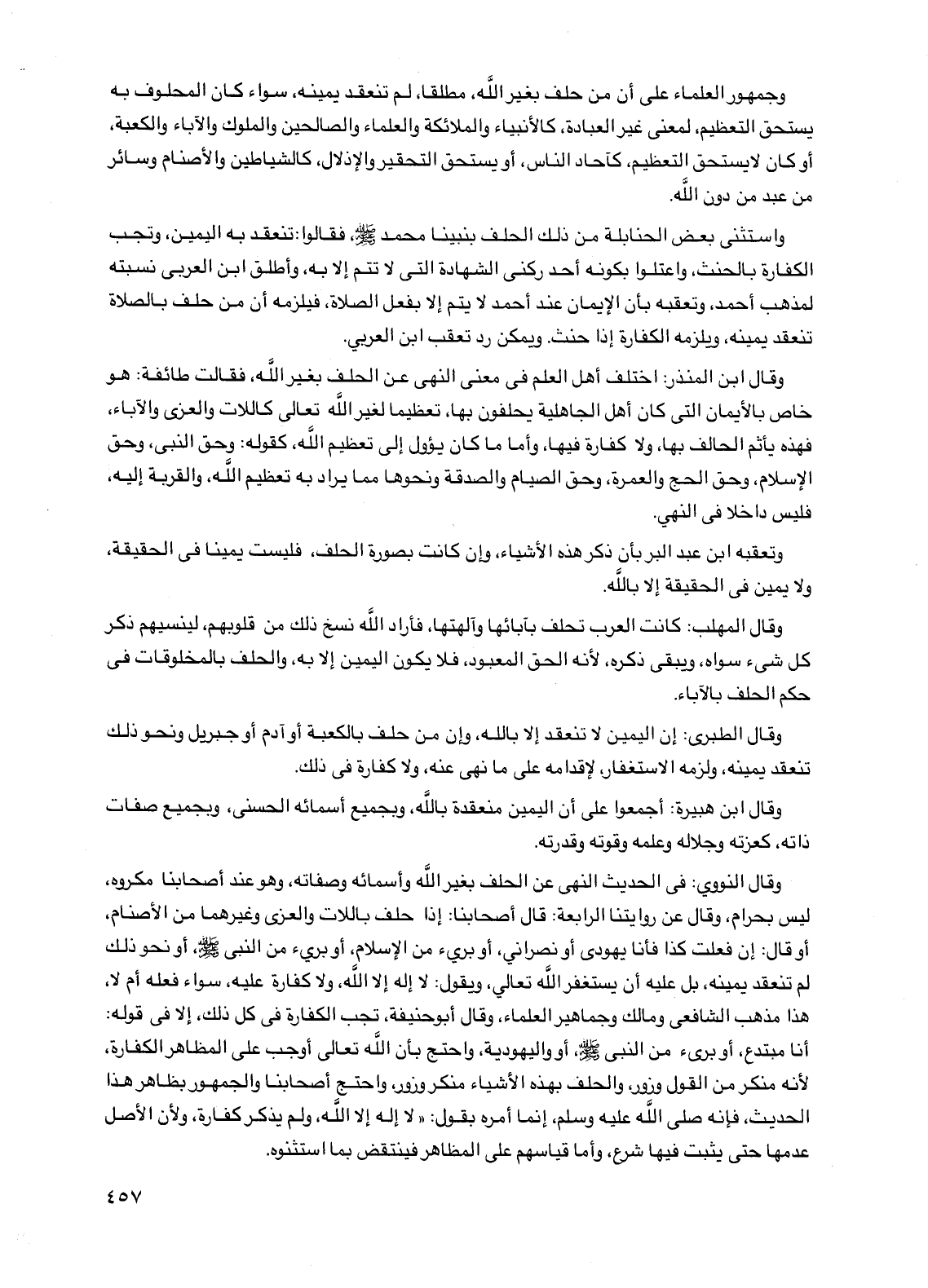وجمهور العلماء على أن من حلف بغير الله، مطلقًا، لم تنعقد يمينه، سواء كان المحلوف به يستحق التعظيم، لمعنى غير العبادة، كالأنبياء والملائكة والعلماء والصالحين والملوك والآباء والكعبة، أو كان لا يستحق التعظيم، كآحاد الناس، أو يستحق التحقير والإذلال، كالشياطين والأصنام وسائر من عبد من دون الله.