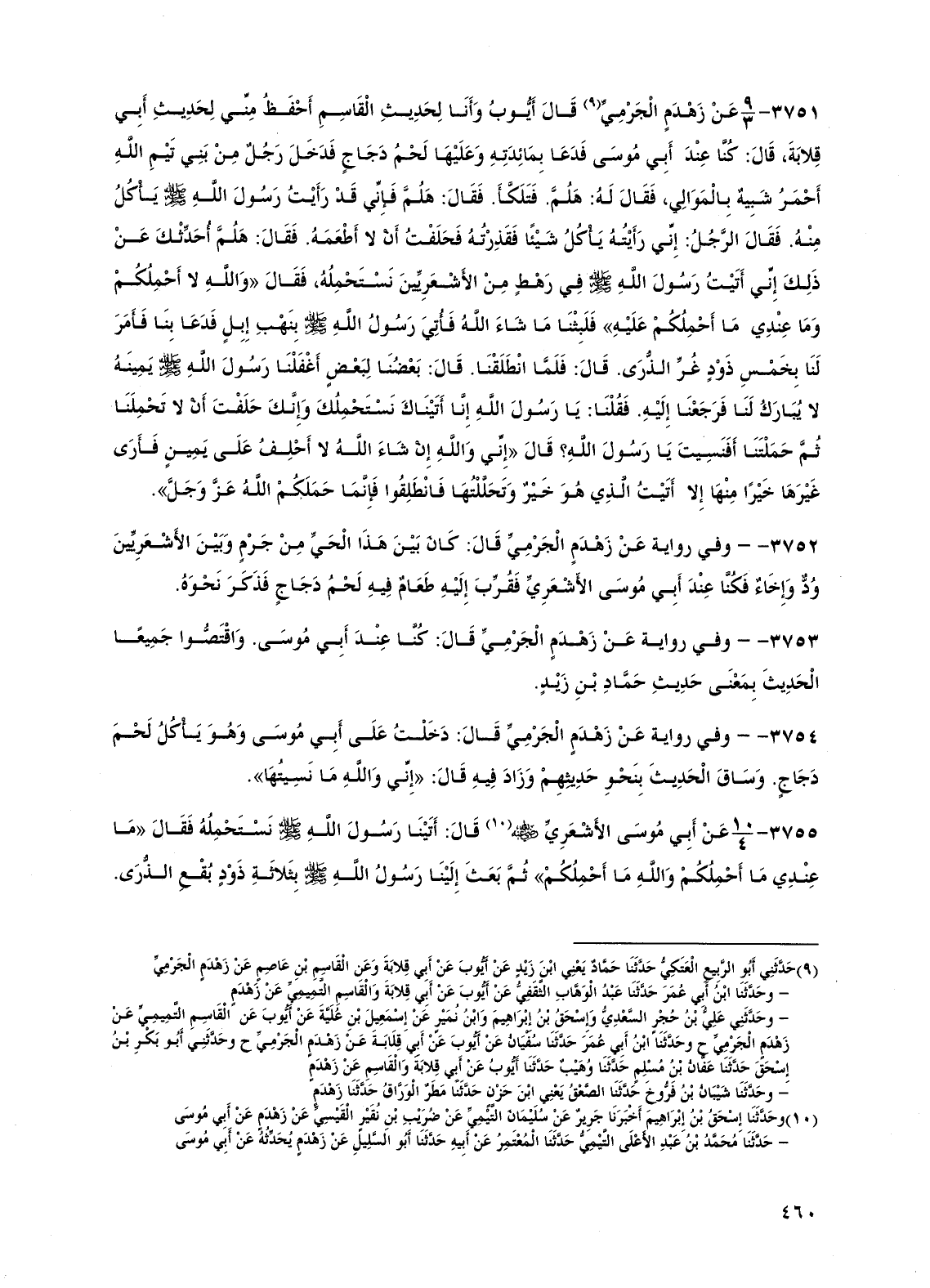 3754 - - وفي رواية عن زهدم الجرمي قال: دخلت على أبي موسى وهو يأكل لحم دجاج. وساق الحديث بنحو حديثهم وزاد فيه قال: "إني والله ما نسيتها".