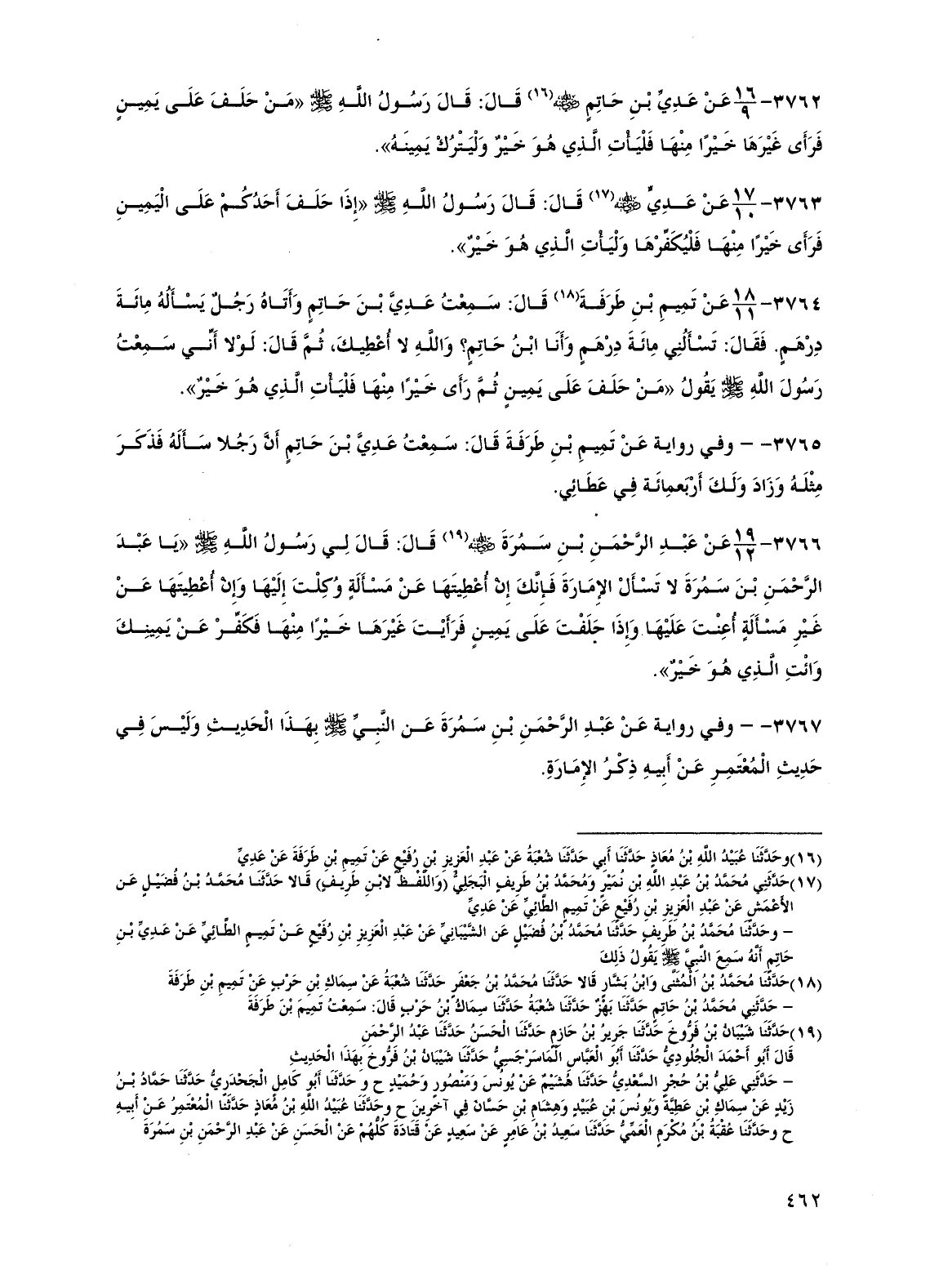 3764 - عن تميم بن طرفة قال: سمعت عدي بن حاتم وأتاه رجل يسأله مائة درهم. فقال: تسألني مائة درهم وأنا ابن حاتم؟ والله لا أعطيك، ثم قال: لولا أني سمعت رسول الله صلى الله عليه وسلم يقول "من حلف على يمين ثم رأى خيرًا منها فليأت الذي هو خير".