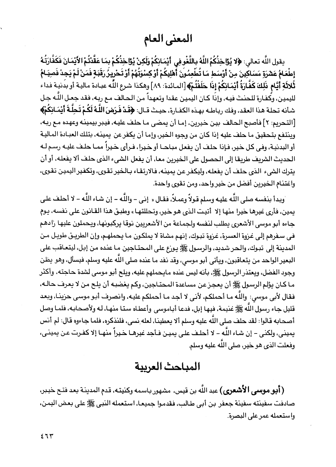 وبدأ بنفسه صلى الله عليه وسلم قولاً وعملاً، فقال "إني - والله - إن شاء الله - لا أحلف على يمين، فأرى غيرها خيرًا منها إلا أتيت الذي هو خير، وتحللتها" وطبق هذا القانون على نفسه، يوم جاءه أبو موسى الأشعري يطلب لنفسه ولجماعة من الأشعريين نوقًا يركبونها، ويحملون عليها زادهم في سفرهم إلى غزوة العسرة، غزوة تبوك، إنهم مشاة لا يملكون ما يحملهم، وإن الطريق طويل من المدينة إلى تبوك، والحر الشديد، والرسول صلى الله عليه وسلم يوزع على المحتاجين ما عنده من إبل، ليتعاقب على البعير الواحد من يتعاقبون، ويأتي أبو موسى، وقد نفد ما عنده صلى الله عليه وسلم، فيسأل، وهو يظن وجود الفضل، ويعتذر الرسول صلى الله عليه وسلم، بأنه ليس عنده ما يحملهم عليه، ويلح أبو موسى لشدة حاجته، وأكثر ما كان يؤلم الرسول صلى الله عليه وسلم أن يعجز عن مساعدة المحتاجين، وكم يغضبه أن يلح من لا يعرف حاله، فقال لأبي موسى: والله ما أحملكم، لأني لا أجد ما أحملكم عليه، وانصرف أبو موسى حزينًا، وبعد قليل جاء رسول الله صلى الله عليه وسلم غنيمة، فيها إبل، فدعا أبا موسى وأعطاه ستًا منها، له ولأصحابه، فلما وصل أصحابه قالوا: لقد حلف صلى الله عليه وسلم ألا يعطينا، لعله نسي، فلنذكره، فلما جاءوه قال: لم أنس يميني، ولكني - إن شاء الله - لا أحلف على يمين فأجد غيرها خيرًا منها إلا كفرت عن يميني، وفعلت الذي هو خير، صلى الله عليه وسلم.
