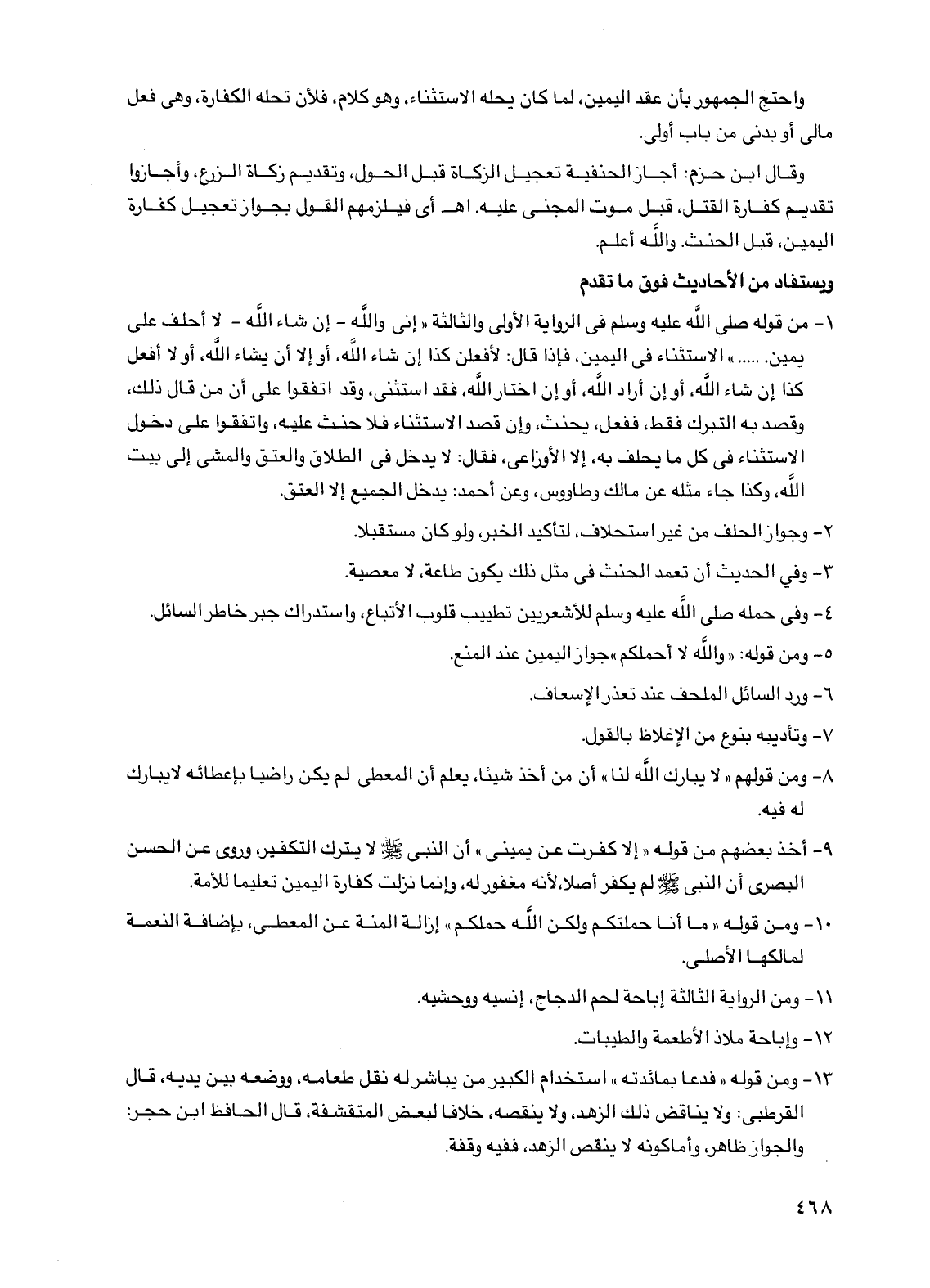 1 - من قوله صلى الله عليه وسلم في الرواية الأولى والثالثة "إني واللَّه - إن شاء الله - لا أحلف على يمين .... " الاستثناء في اليمين، فإذا قال: لأفعلن كذا إن شاء الله، أو إلا أن يشاء الله، أو لا أفعل كذا إن شاء الله، أو إن أراد الله، أو إن اختار الله، فقد استثنى، وقد اتفقوا على أن من قال ذلك، وقصد به التبرك فقط، ففعل، يحنث، وإن قصد الاستثناء فلا حنث عليه، واتفقوا على دخول الاستثناء في كل ما يحلف به، إلا الأوزاعي، فقال: لا يدخل في الطلاق والعتق والمشي إلى بيت الله، وكذا جاء مثله عن مالك وطاووس، وعن أحمد: يدخل الجميع إلا العتق.