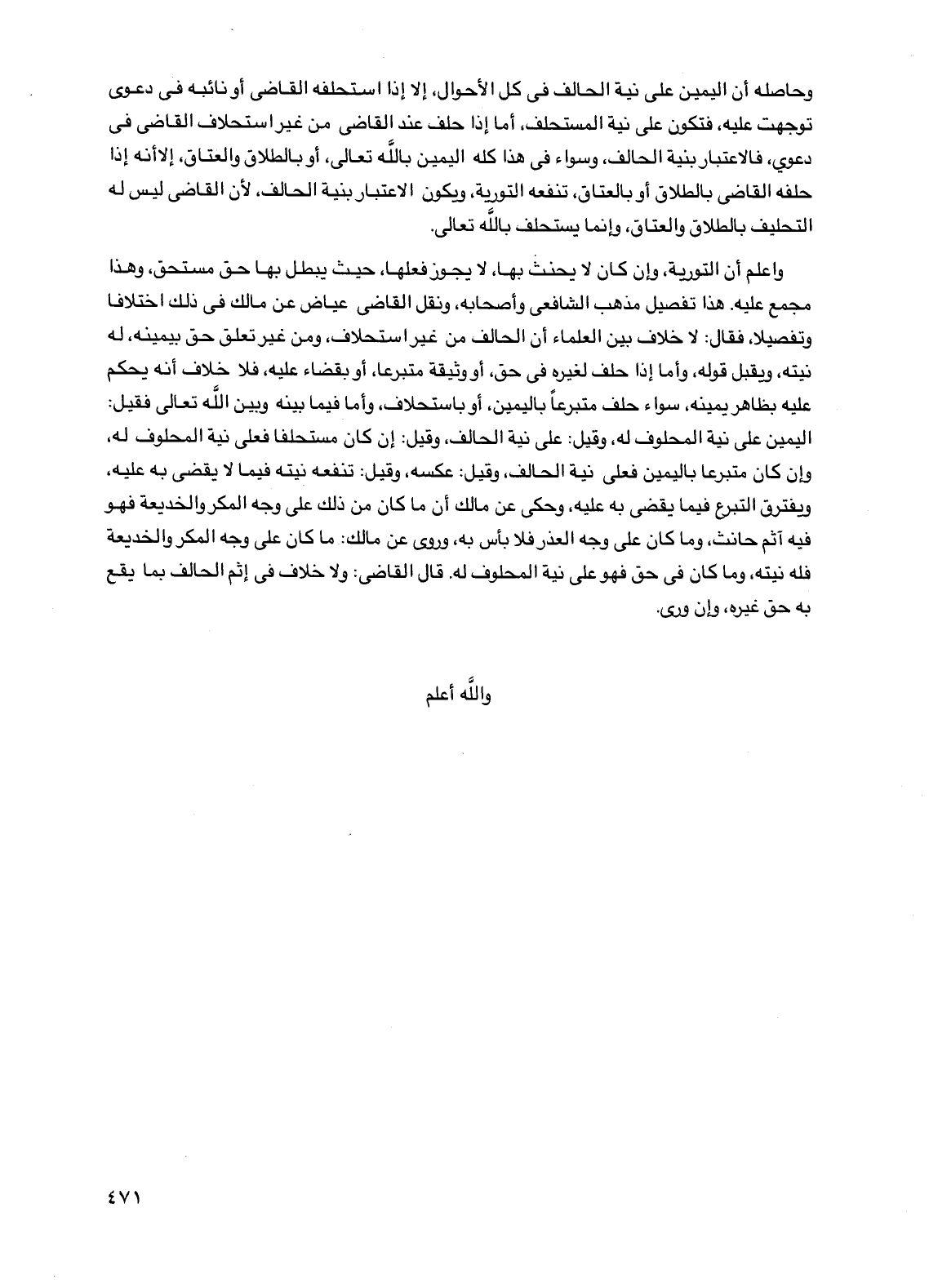 وحاصله أن اليمين على نية الحالف في كل الأحوال، إلا إذا استحلفه القاضي أو نائبه في دعوى توجهت عليه، فتكون على نية المستحلف، أما إذا حلف عند القاضي من غير استحلاف القاضي في دعوى، فالاعتبار بنية الحالف، وسواء في هذا كله اليمين بالله تعالى، أو بالطلاق والعتاق، إلا أنه إذا حلفه القاضي بالطلاق أو بالعتاق، تنفعه التورية، ويكون الاعتبار بنية الحالف، لأن القاضي ليس له التحليف بالطلاق والعتاق، وإنما يستحلف بالله تعالى.
