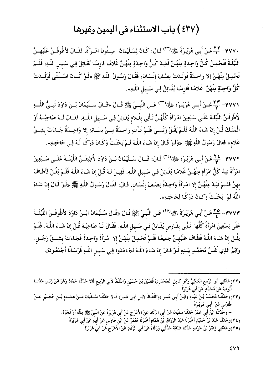 3772 - عن أبي هريرة رضي الله عنه قال: قال سليمان بن داود لأطيفن الليلة على سبعين امرأة تلد كل امرأة منهن غلامًا يقاتل في سبيل الله. فقيل له قل إن شاء الله فلم يقل فأطاف بهن فلم تلد منهن إلا امرأة واحدة نصف إنسان. قال: فقال رسول الله صلى الله عليه وسلم "لو قال إن شاء الله لم يحنث وكان دركًا لحاجته".