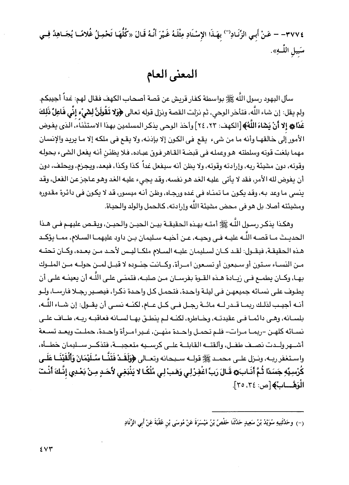 وهكذا يذكر رسول الله صلى الله عليه وسلم أمته بهذه الحقيقة بين الحين والحين، ويقص عليهم في هذا الحديث ما قصه الله عليه في وحيه، عن أخيه سليمان بن داود عليهما السلام، مما يؤكد هذه الحقيقة، فيقول: لقد كان لسليمان عليه السلام ملكًا ليس لأحد من بعده، وكان تحته من النساء ستون أو سبعون أو تسعون امرأة، وكانت جنوده لا قبل لمن حوله من الملوك بها، وكان يطمع في زيادة هذه القوة بفرسان من صلبه، فتمنى على الله أن يعينه على أن يطوف على نسائه جميعهن في ليلة واحدة، فتحمل كل واحدة ذكرًا، فيصير رجلاً فارسًا، ولو أنه أجيب لذلك ربما قدر له مائة رجل في كل عام، لكنه نسي أن يقول: إن شاء الله، بلسانه، وهي دائمًا في عقيدته، وخاطره، لكنه لم ينطق بها لسانه فعاقبه ربه، طاف على نسائه كلهن - ربما مرات - فلم تحمل واحدة منهن، غير امرأة واحدة، حملت وبعد تسعة أشهر ولدت نصف طفل، وألقته القابلة على كرسيه متعجبة، فتذكر سليمان خطأه، واستغفر ربه، ونزل على محمد صلى الله عليه وسلم قوله سبحانه وتعالى {ولقد فتنا سليمان وألقينا على كرسيه جسدًا ثم أناب * قال رب اغفر لي وهب لي ملكًا لا ينبغي لأحد من بعدي إنك أنت الوهاب} [ص: 34، 35].