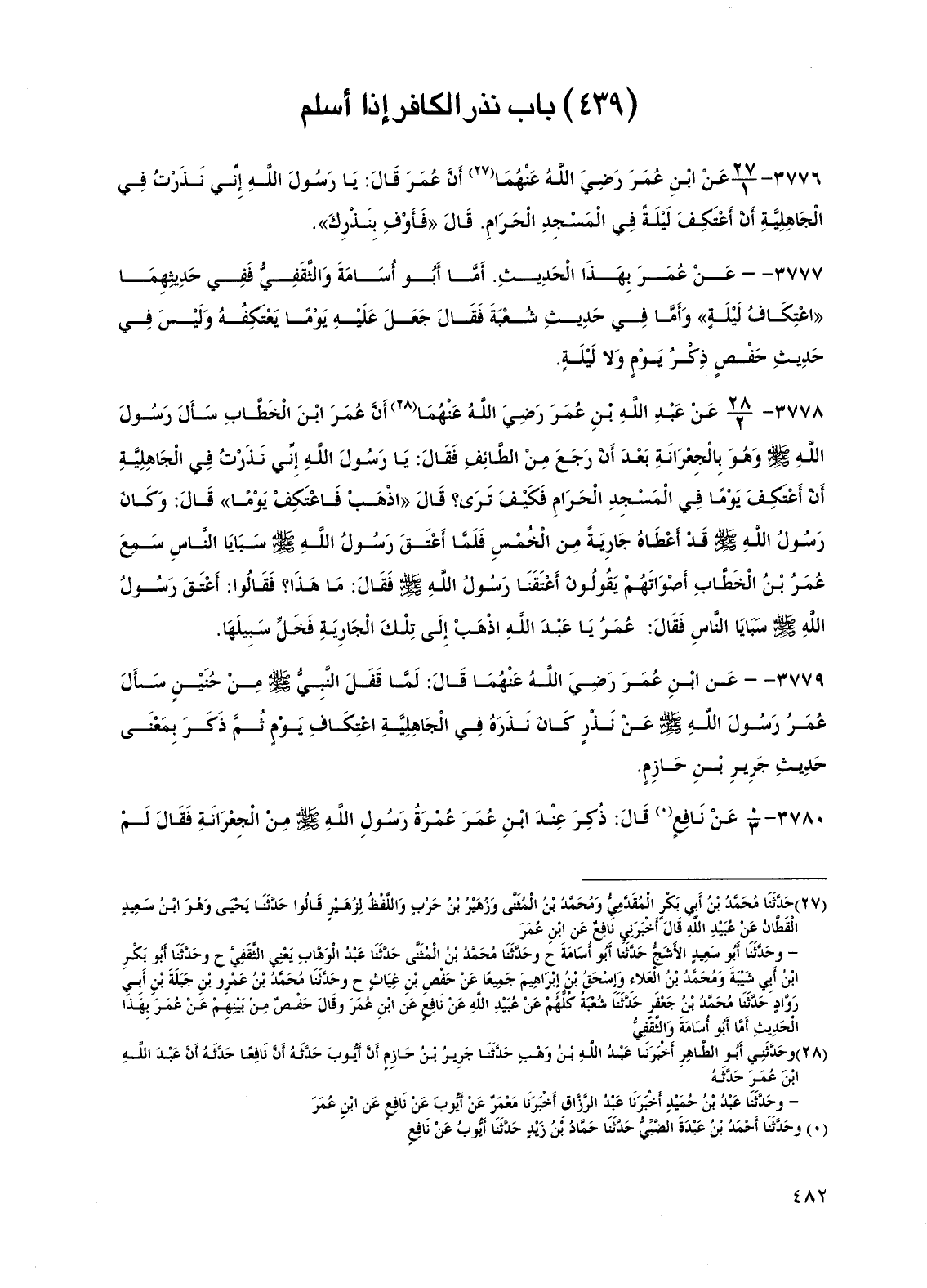 3779 - - عن ابن عمر رضي الله عنهما قال: لما قفل النبي صلى الله عليه وسلم من حنين سأل عمر رسول الله صلى الله عليه وسلم عن نذر كان نذره في الجاهلية اعتكاف يوم ثم ذكر بمعنى حديث جرير بن حازم.