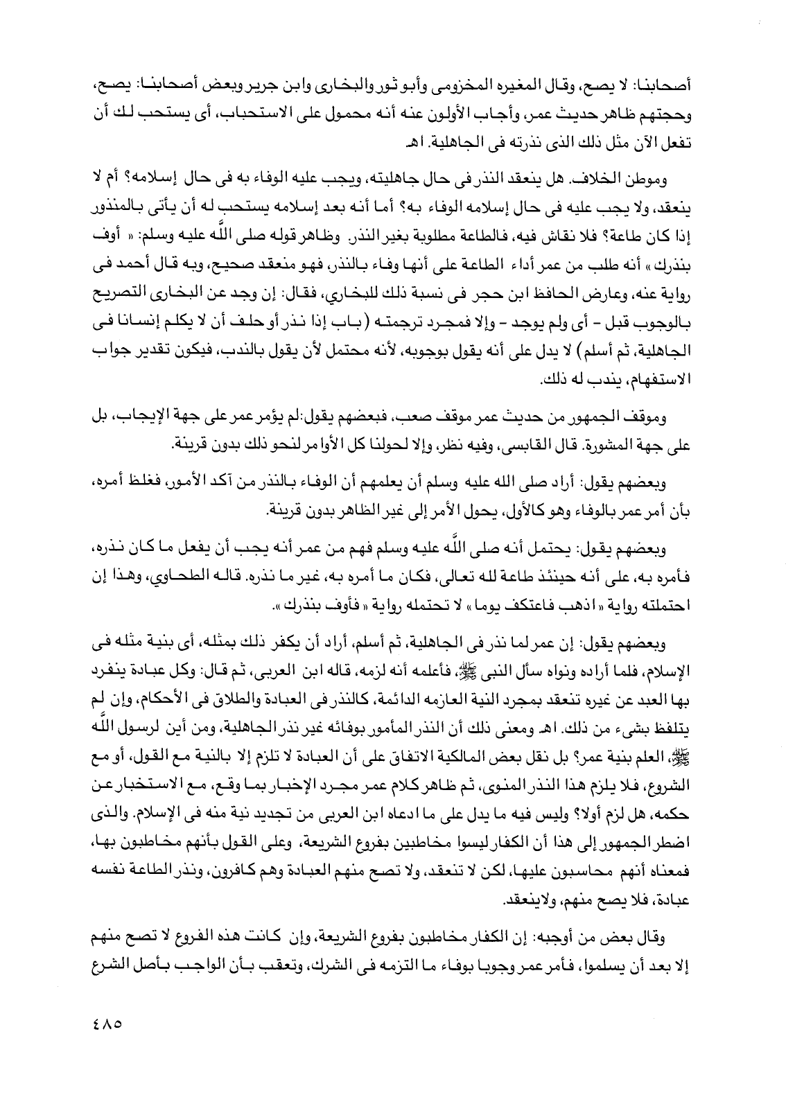 وقال بعض من أوجبه: إن الكفار مخاطبون بفروع الشريعة، وإن كانت هذه الفروع لا تصح منهم إلا بعد أن يسلموا، فأمر عمر وجوبًا بوفاء ما التزمه في الشرك، وتعقب بأن الواجب بأصل الشرع