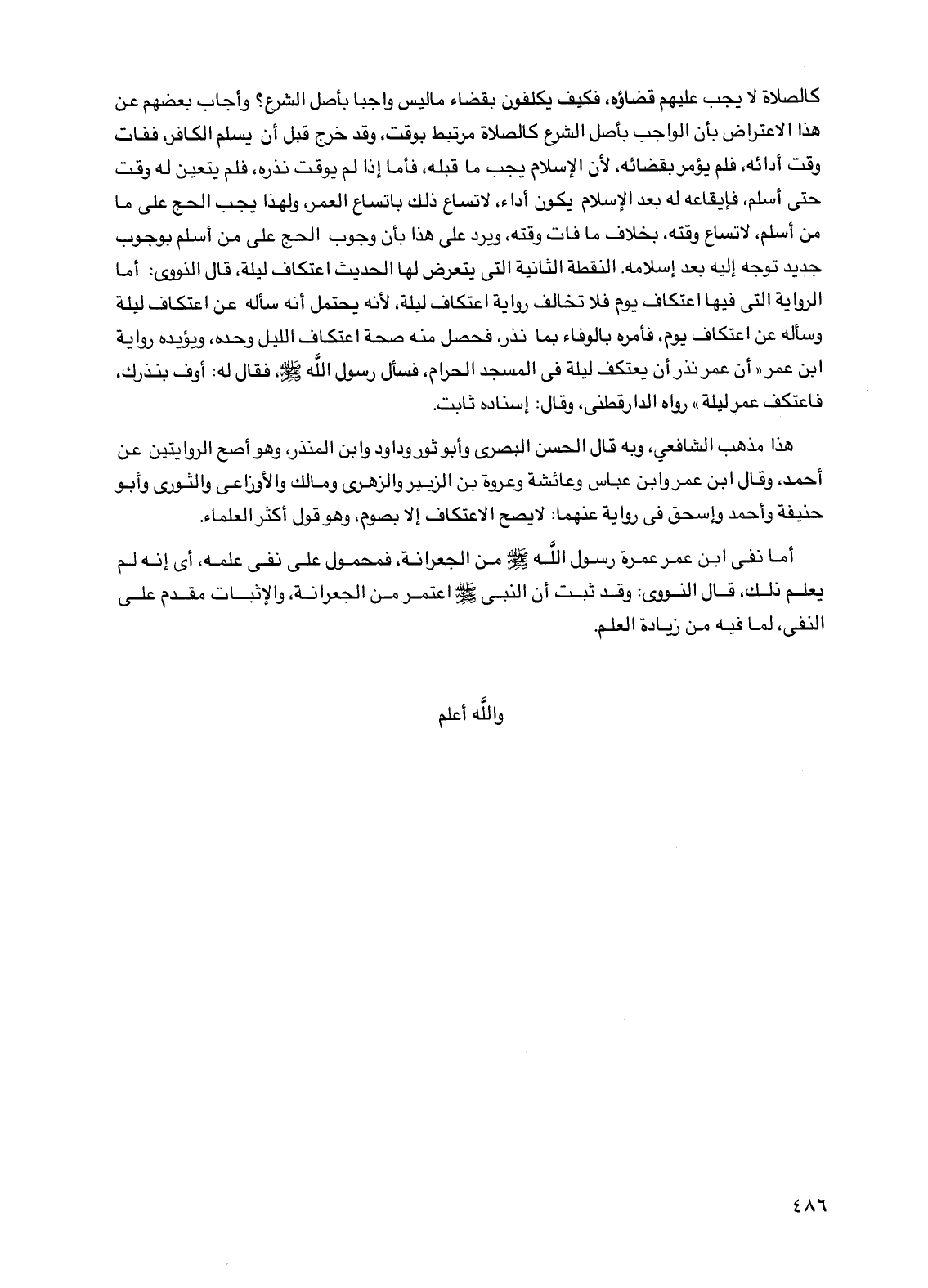 كالصلاة لا يجب عليهم قضاؤه، فكيف يكلفون بقضاء ما ليس واجبًا بأصل الشرع؟ وأجاب بعضهم عن هذا الاعتراض بأن الواجب بأصل الشرع كالصلاة مرتبط بوقت، وقد خرج قبل أن يسلم الكافر، ففات وقت أدائه، فلم يؤمر بقضائه، لأن الإسلام يجب ما قبله، فأما إذا لم يوقت نذره، فلم يتعين له وقت حتى أسلم، فإيقاعه له بعد الإسلام يكون أداء، لاتساع ذلك باتساع العمر، ولهذا يجب الحج على ما من أسلم، لاتساع وقته، بخلاف ما فات وقته، ويرد على هذا بأن وجوب الحج على من أسلم بوجوب جديد توجه إليه بعد إسلامه. النقطة الثانية التي يتعرض لها الحديث اعتكاف ليلة، قال النووي: أما الرواية التي فيها اعتكاف يوم فلا تخالف رواية اعتكاف ليلة، لأنه يحتمل أنه سأله عن اعتكاف ليلة وسأله عن اعتكاف يوم، فأمره بالوفاء بما نذر، فحصل منه صحة اعتكاف الليل وحده، ويؤيده رواية ابن عمر "أن عمر نذر أن يعتكف ليلة في المسجد الحرام، فسأل رسول الله صلى الله عليه وسلم، فقال له: أوف بنذرك، فاعتكف عمر ليلة" رواه الدارقطني، وقال: إسناده ثابت.