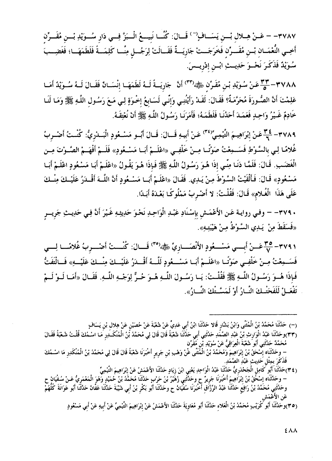 3787 - - عن هلال بن يساف قال: كنا نبيع البز في دار سويد بن مقرن أخي النعمان بن مقرن فخرجت جارية فقالت لرجل منا كلمة فلطمها؛ فغضب سويد فذكر نحو حديث ابن إدريس.