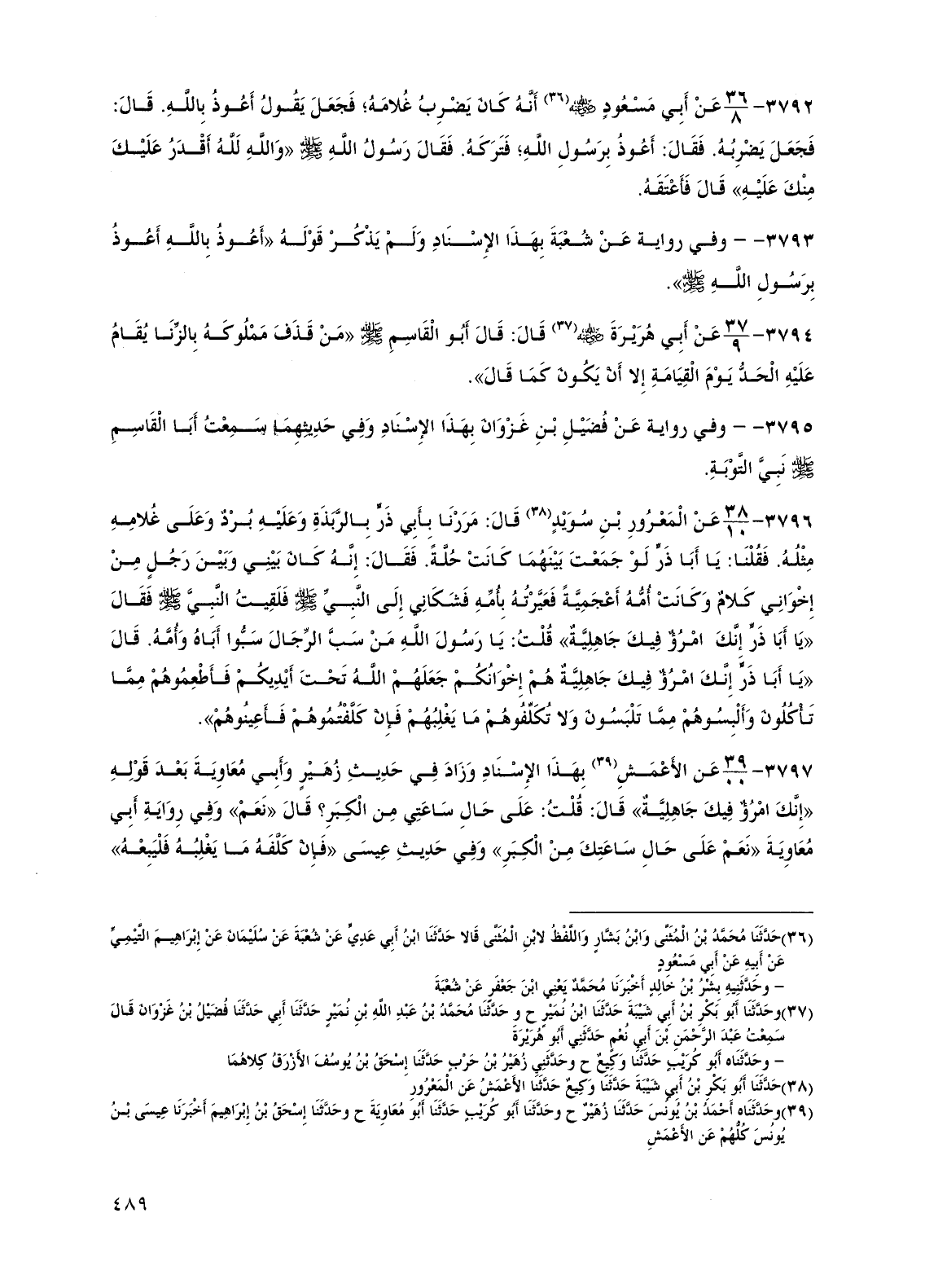 3797 - عن الأعمش بهذا الإسناد وزاد في حديث زهير وأبي معاوية بعد قوله "إنك امرؤ فيك جاهلية" قال: قلت: على حال ساعتي من الكبر؟ قال "نعم" وفي رواية أبي معاوية "نعم على حال ساعتك من الكبر" وفي حديث عيسى "فإن كلفه ما يغلبه فليبعه"