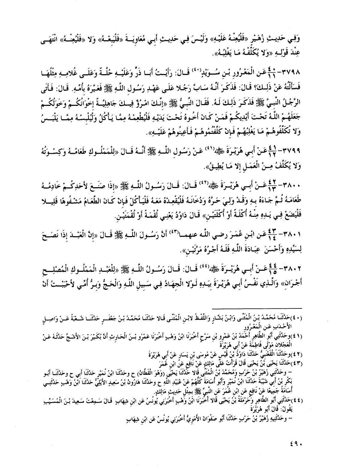 3799 - عن أبي هريرة رضي الله عنه عن رسول الله صلى الله عليه وسلم أنه قال "للمملوك طعامه وكسوته ولا يكلف من العمل إلا ما يطيق".