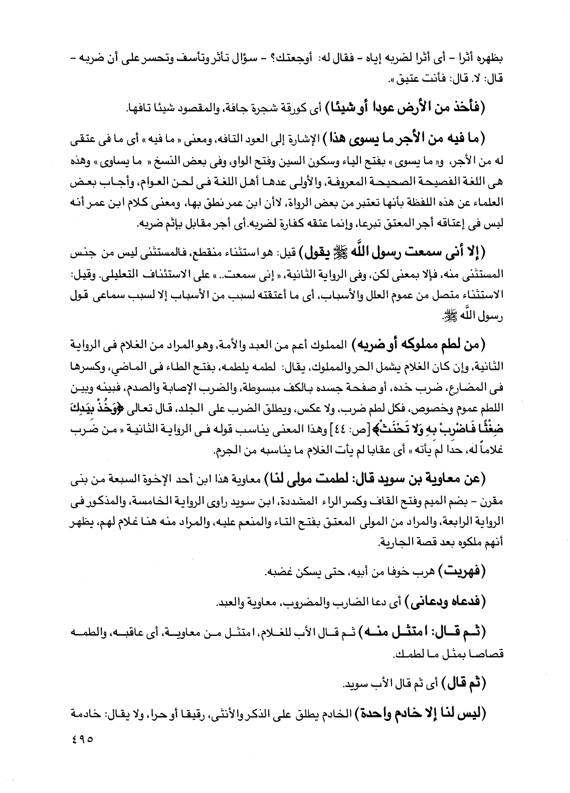 (ما فيه من الأجر ما يسوى هذا) الإشارة إلى العود التافه، ومعنى "ما فيه" أي ما في عتقي له من الأجر، و"ما يسوى" بفتح الياء وسكون السين وفتح الواو، وفي بعض النسخ "ما يساوى" وهذه هي اللغة الفصيحة الصحيحة المعروفة، والأولى عدها أهل اللغة في لحن العوام، وأجاب بعض العلماء عن هذه اللفظة بأنها تعتبر من بعض الرواة، لا أن ابن عمر نطق بها، ومعنى كلام ابن عمر أنه ليس في إعتاقه أجر المعتق تبرعًا، وإنما عتقه كفارة لضربه. أي أجر مقابل بإثم ضربه.