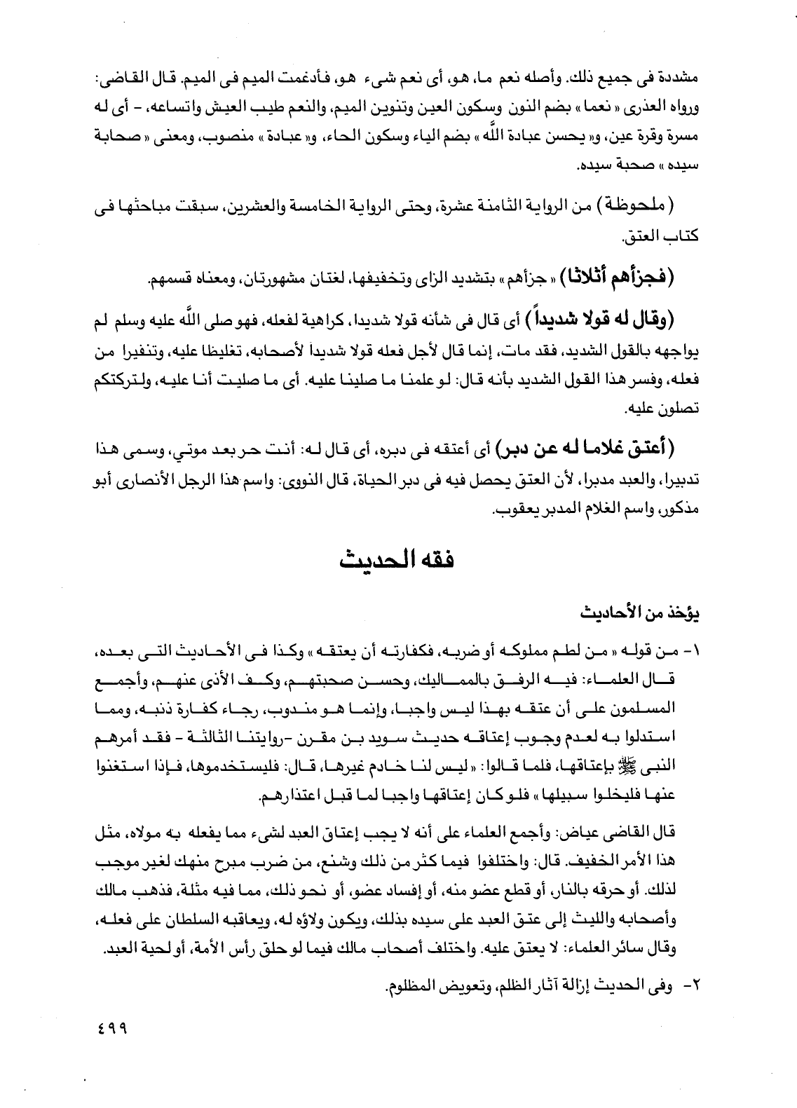 1 - من قوله "من لطم مملوكه أو ضربه، فكفارته أن يعتقه" وكذا في الأحاديث التي بعده، قال العلماء: فيه الرفق بالمماليك، وحسن صحبتهم، وكف الأذى عنهم، وأجمع المسلمون على أن عتقه بهذا ليس واجبًا، وإنما هو مندوب، رجاء كفارة ذنبه، ومما استدلوا به لعدم وجوب إعتاقه حديث سويد بن مقرن -روايتنا الثالثة- فقد أمرهم النبي صلى الله عليه وسلم بإعتاقها، فلما قالوا: "ليس لنا خادم غيرها، قال: فليستخدموها، فإذا استغنوا عنها فليخلوا سبيلها" فلو كان إعتاقها واجبًا لما قبل اعتذارهم.