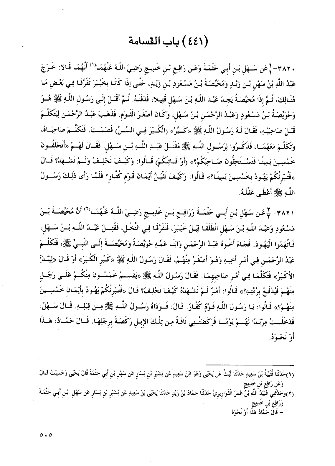 3820 - عن سهل بن أبي حثمة وعن رافع بن خديج رضي الله عنهما أنهما قالا: خرج عبد الله بن سهل بن زيد ومحيصة بن مسعود بن زيد، حتى إذا كانا بخيبر تفرقا في بعض ما هنالك، ثم إذا محيصة يجد عبد الله بن سهل قتيلاً، فدفنه. ثم أقبل إلى رسول الله صلى الله عليه وسلم هو وحويصة بن مسعود وعبد الرحمن بن سهل، وكان أصغر القوم. فذهب عبد الرحمن ليتكلم قبل صاحبيه، فقال له رسول الله صلى الله عليه وسلم "كبر" (الكبر في السن) فصمت، فتكلم صاحباه، وتكلم معهما، فذكروا لرسول الله صلى الله عليه وسلم مقتل عبد الله بن سهل. فقال لهم "أتحلفون خمسين يمينًا فتستحقون صاحبكم؟ " (أو قاتلكم) قالوا: وكيف نحلف ولم نشهد؟ قال "فتبرئكم يهود بخمسين يميناً؟ " قالوا: وكيف نقبل أيمان قوم كفار؟ فلما رأى ذلك رسول الله صلى الله عليه وسلم أعطى عقله.