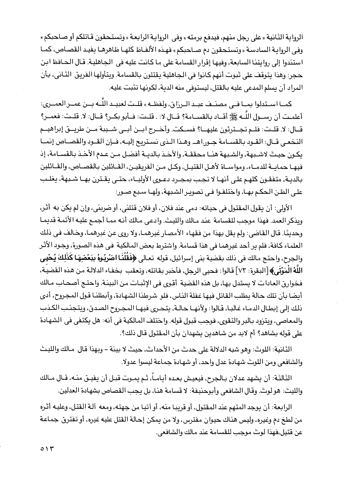 كما استدلوا بما في مصنف عبد الرزاق، ولفظه" قلت لعبيد الله بن عمر العمري: أعلمت أن رسول الله صلى الله عليه وسلم أقاد بالقسامة؟ قال: لا. قلت: فأبو بكر؟ قال: لا. قلت: فعمر؟ قال: لا. قلت: فلم تجترئون عليها؟ فسكت. وأخرج ابن أبي شيبة من طريق إبراهيم النخعي قال: القود بالقسامة جور. اهـ وهذا الذي نستريح إليه، فإن القود والقصاص إنما يكون حيث لا شبهة، والشبهة هنا محققة، والأخذ بالدية أفضل من عدم الأخذ بالقسامة، إذ فيها حماية للدماء، ومواساة لأهل القتيل، وكل من الفريقين، القائلين بالقصاص، والقائلين بالدية، متفقون كلهم على أنها لا تجب بمجرد دعوى الأولياء، حتى يقترن بها شبهة، يغلب على الظن الحكم بها، واختلفوا في تصوير الشبهة، ولها سبع صور: