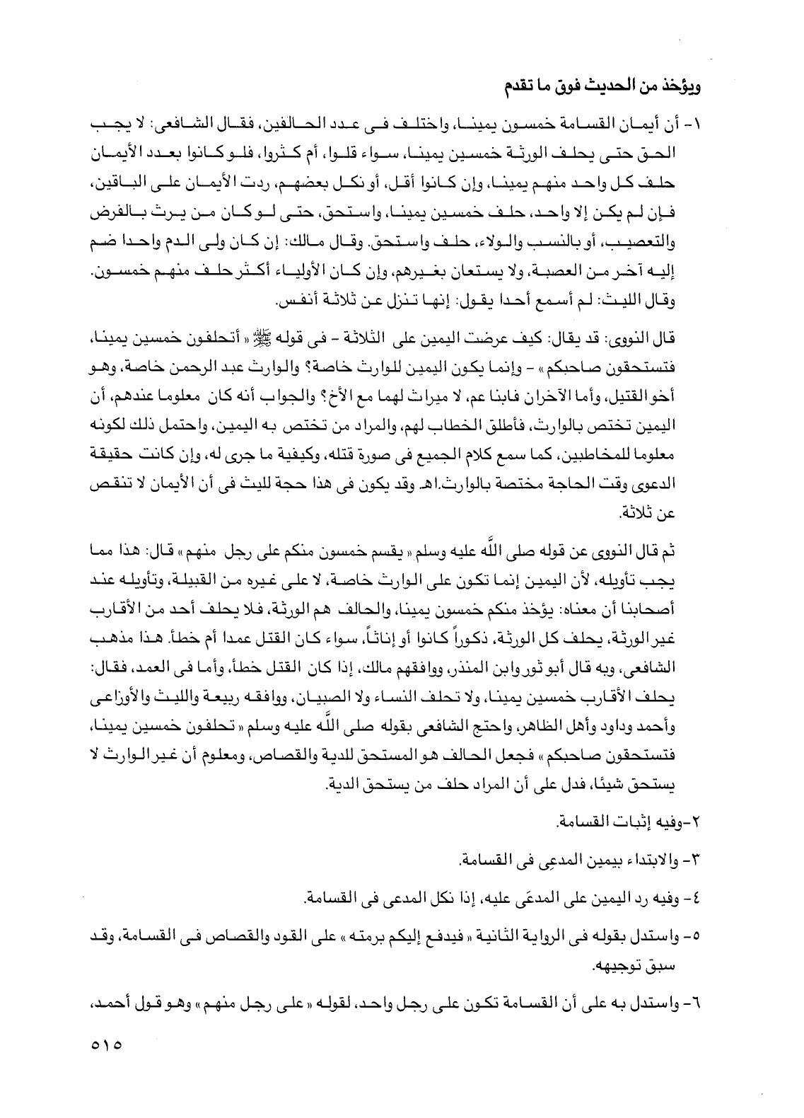 ثم قال النووي عن قوله صلى الله عليه وسلم "يقسم خمسون منكم على رجل منهم" قال: هذا مما يجب تأويله، لأن اليمين إنما تكون على الوارث خاصة، لا على غيره من القبيلة، وتأويله عند أصحابنا أن معناه: يؤخذ منكم خمسون يمينًا، والحالف هم الورثة، فلا يحلف أحد من الأقارب غير الورثة، يحلف كل الورثة، ذكورًا كانوا أو إناثًا، سواء كان القتل عمدا أم خطأ. هذا مذهب الشافعي، وبه قال أبو ثور وابن المنذر، ووافقهم مالك، إذا كان القتل خطأ، وأما في العمد، فقال: يحلف الأقارب خمسين يمينًا، ولا تحلف النساء ولا الصبيان، ووافقه ربيعة والليث والأوزاعي وأحمد وداود وأهل الظاهر، واحتج الشافعي بقوله صلى الله عليه وسلم "تحلفون خمسين يمينًا، فتستحقون صاحبكم" فجعل الحالف هو المستحق للدية والقصاص، ومعلوم أن غير الوارث لا يستحق شيئًا، فدل على أن المراد حلف من يستحق الدية.