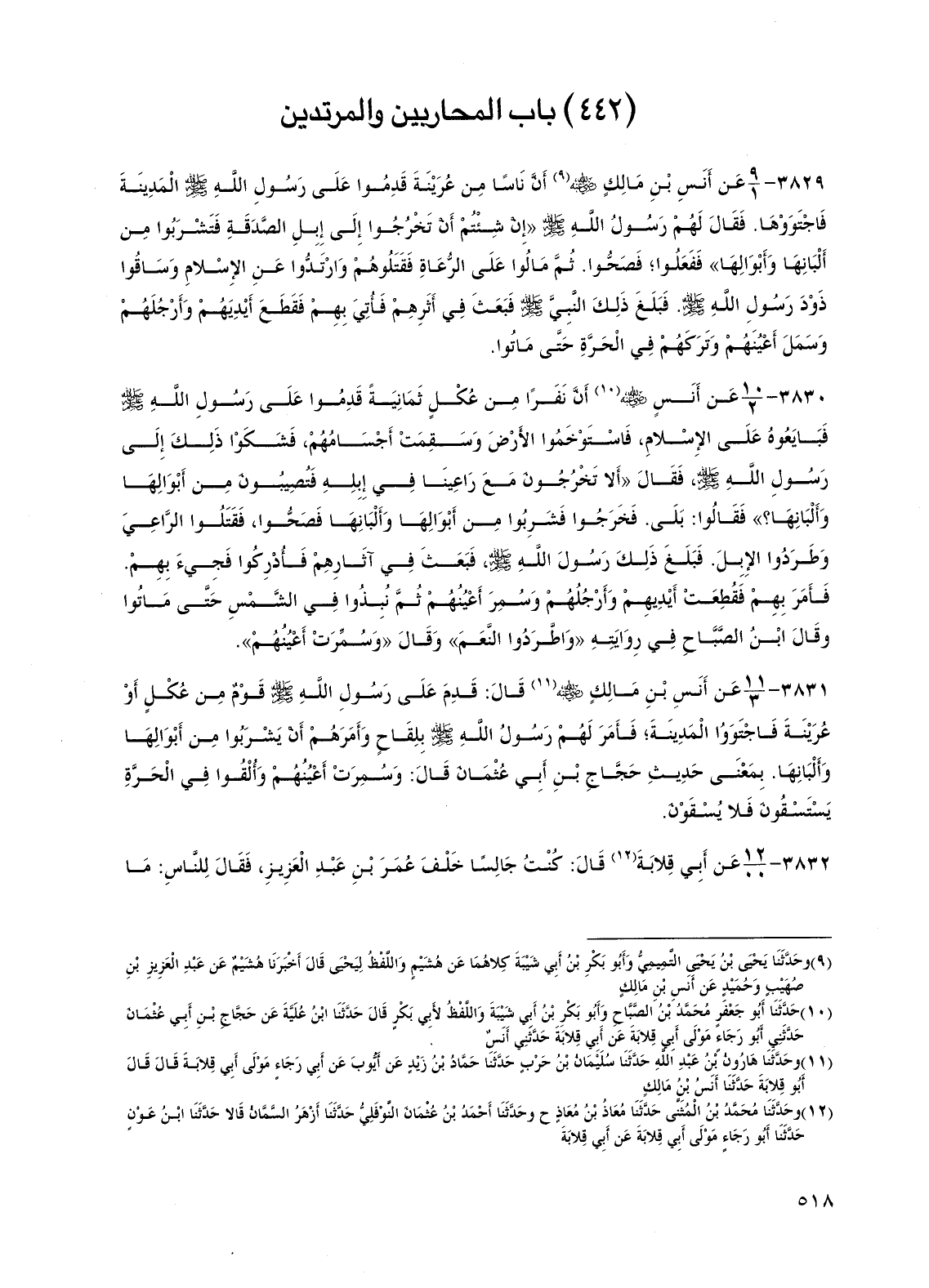 3830 - عن أنس رضي الله عنه أن نفراً من عكل ثمانية قدموا على رسول الله صلى الله عليه وسلم فبايعوه على الإسلام، فاستوخموا الأرض وسقمت أجسامهم، فشكوا ذلك إلى رسول الله صلى الله عليه وسلم، فقال "ألا تخرجون مع راعينا في إبله فتصيبون من أبوالها وألبانها؟ " فقالوا: بلى. فخرجوا فشربوا من أبوالها وألبانها فصحوا، فقتلوا الراعي وطردوا الإبل. فبلغ ذلك رسول الله صلى الله عليه وسلم، فبعث في آثارهم فأدركوا فجيء بهم. فأمر بهم فقطعت أيديهم وأرجلهم وسمر أعينهم ثم نبذوا في الشمس حتى ماتوا وقال ابن الصباح في روايته "واطردوا النعم" وقال "وسمرت أعينهم".